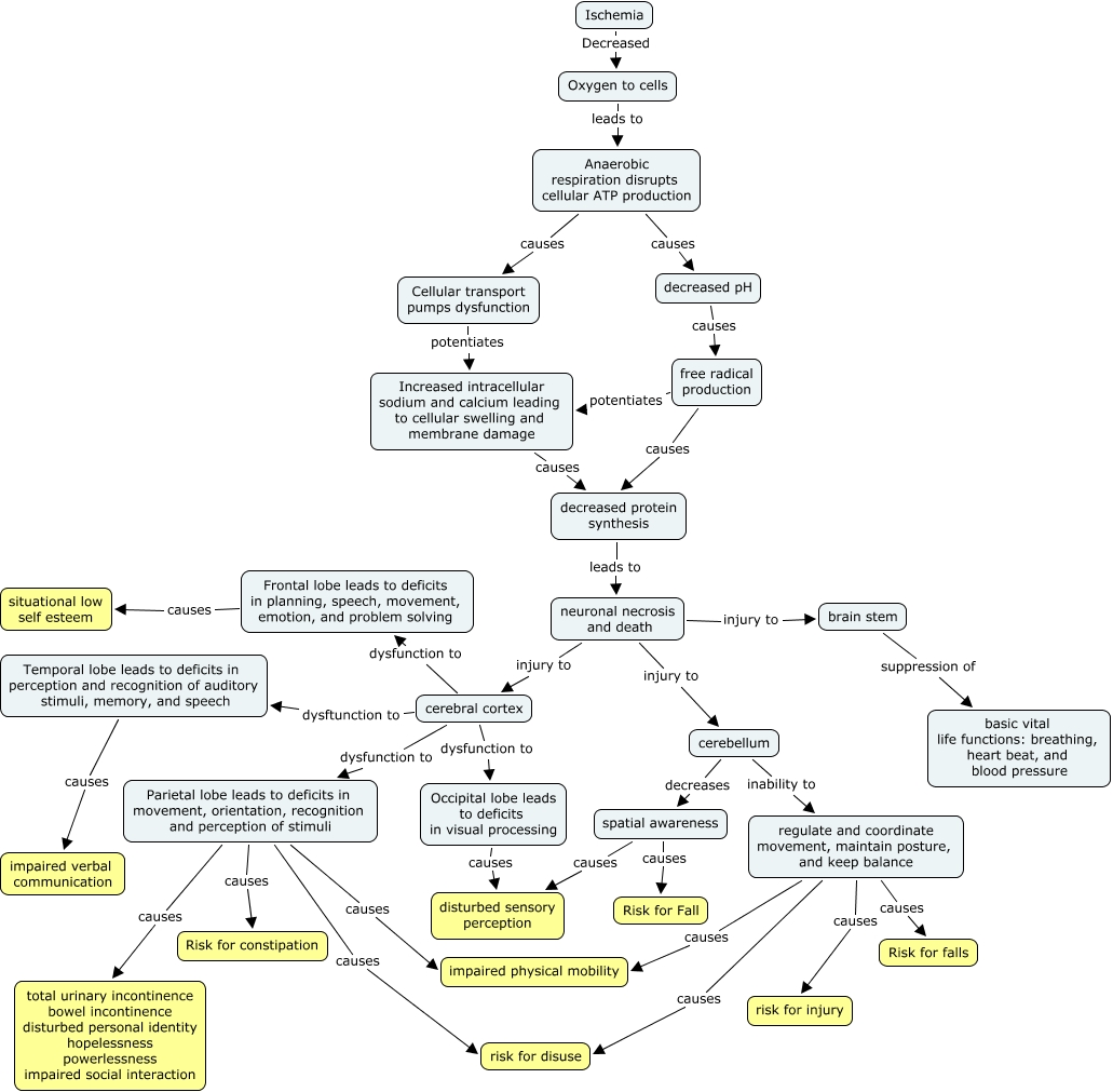 This Concept Map, created with IHMC CmapTools, has information related to: Simplified map, Cellular transport pumps dysfunction potentiates Increased intracellular sodium and calcium leading to cellular swelling and membrane damage, Anaerobic respiration disrupts cellular ATP production causes decreased pH, cerebral cortex dysfunction to Frontal lobe leads to deficits in planning, speech, movement, emotion, and problem solving, neuronal necrosis and death injury to cerebellum, free radical production potentiates Increased intracellular sodium and calcium leading to cellular swelling and membrane damage, Frontal lobe leads to deficits in planning, speech, movement, emotion, and problem solving causes situational low self esteem, brain stem suppression of basic vital life functions: breathing, heart beat, and blood pressure, Oxygen to cells leads to Anaerobic respiration disrupts cellular ATP production, decreased protein synthesis leads to neuronal necrosis and death, spatial awareness causes Risk for Fall, cerebral cortex dysfunction to Parietal lobe leads to deficits in movement, orientation, recognition and perception of stimuli, Parietal lobe leads to deficits in movement, orientation, recognition and perception of stimuli causes total urinary incontinence bowel incontinence disturbed personal identity hopelessness powerlessness impaired social interaction, Parietal lobe leads to deficits in movement, orientation, recognition and perception of stimuli causes Risk for constipation, Parietal lobe leads to deficits in movement, orientation, recognition and perception of stimuli causes risk for disuse, cerebellum decreases spatial awareness, decreased pH causes free radical production, Increased intracellular sodium and calcium leading to cellular swelling and membrane damage causes decreased protein synthesis, cerebellum inability to regulate and coordinate movement, maintain posture, and keep balance, Anaerobic respiration disrupts cellular ATP production causes Cellular transport pumps dysfunction, regulate and coordinate movement, maintain posture, and keep balance causes Risk for falls