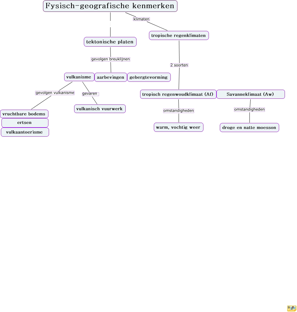 Deze Concept Map heeft informatie gerelateerd aan: fysisch-geografische kenmerken, tektonische platen gevolgen breuklijnen aarbevingen, vulkanisme gevolgen vulkanisme vruchtbare bodems, tropische regenklimaten 2 soorten tropisch regenwoudklimaat (Af), Fysisch-geografische kenmerken klimaten tropische regenklimaten, tropisch regenwoudklimaat (Af) omstandigheden warm, vochtig weer, vulkanisme gevaren vulkanisch vuurwerk, Savanneklimaat (Aw) omstandigheden droge en natte moesson, Fysisch-geografische kenmerken tektonische platen