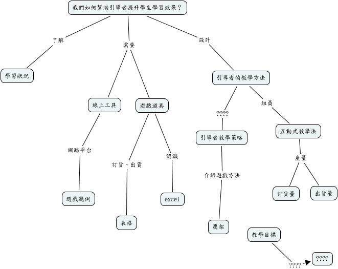 此概念图以 IHMC CmapTools 创建, 内含信息有关于: 990322-概念圖-釐清設計問題-引導者組 惠蓮, 互動式教學法 產量 出貨量, 遊戲道具 訂貨、出貨 表格, 引導者的教學方法 ???? 引導者教學策略, 遊戲道具 認識 excel, 我們如何幫助引導者提升學生學習效果? 需要 線上工具, 我們如何幫助引導者提升學生學習效果? 設計 引導者的教學方法, 引導者的教學方法 組員 互動式教學法, 互動式教學法 產量 訂貨量, 我們如何幫助引導者提升學生學習效果? 需要 遊戲道具, 引導者教學策略 介紹遊戲方法 鷹架, 我們如何幫助引導者提升學生學習效果? 了解 學習狀況, 線上工具 網路平台 遊戲範例, 教學目標 ???? ????