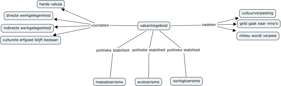 Deze Concept Map heeft informatie gerelateerd aan: h3 (par.2), vakantiegebied nadelen cultuurverpesting, vakantiegebied voordelen culturele erfgoed blijft bestaan, vakantiegebied voordelen harde valuta, vakantiegebied politieke stabiliteit ecotoerisme, vakantiegebied politieke stabiliteit oorlogtoerisme, vakantiegebied nadelen milieu wordt verpest, vakantiegebied voordelen indirecte werkgelegenheid, vakantiegebied nadelen geld gaat naar mno's, vakantiegebied politieke stabiliteit massatoerisme, vakantiegebied voordelen directe werkgelegenheid