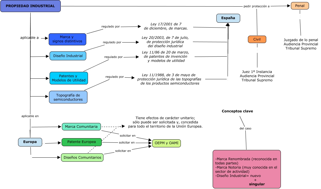 Este Cmap, tiene información relacionada con: Mapa Conceptual CASO 4, Diseños Comunitarios Tiene efectos de carácter unitario; sólo puede ser solicitada y, concedida para todo el territorio de la Unión Europea., Conceptos clave del caso -Marca Renombrada (reconocida en todas partes) -Marca Notoria (muy conocida en el sector de actividad) -Diseño Industrial= nuevo + singular, Patente Europea solicitar en OEPM y OAMI, Penal Juzgado de lo penal Audiencia Provincial Tribunal Supremo, Europa Diseños Comunitarios, Topografía de semiconductores regulado por Ley 11/1988, de 3 de mayo de protección jurídica de las topografías de los productos semiconductores, Europa Marca Comunitaria, Marca Comunitaria Tiene efectos de carácter unitario; sólo puede ser solicitada y, concedida para todo el territorio de la Unión Europea., Ley 17/2001 de 7 de diciembre, de marcas. España, Marca y signos distintivos regulado por Ley 17/2001 de 7 de diciembre, de marcas., Ley 20/2003, de 7 de julio, de protección jurídica del diseño industrial España, Ley 11/1988, de 3 de mayo de protección jurídica de las topografías de los productos semiconductores España, Civil Juez 1º Instancia Audiencia Provincial Tribunal Supremo, Patentes y Modelos de Utilidad regulado por Ley 11/86 de 20 de marzo, de patentes de invención y modelos de utilidad, PROPIEDAD INDUSTRIAL aplicable a Diseño Industrial, Diseños Comunitarios solicitar en OEPM y OAMI, PROPIEDAD INDUSTRIAL aplicable a Topografía de semiconductores, PROPIEDAD INDUSTRIAL pedir protección a Penal, Ley 11/86 de 20 de marzo, de patentes de invención y modelos de utilidad España, Marca Comunitaria solicitar en OEPM y OAMI
