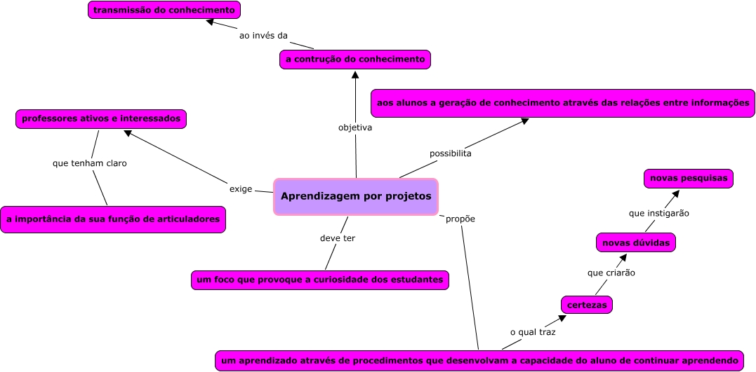 Esse mapa conceitual, produzido no IHMC CmapTools, tem a informação relacionada a: Mapa Conceitual do Texto, Aprendizagem por projetos propõe um aprendizado através de procedimentos que desenvolvam a capacidade do aluno de continuar aprendendo, Aprendizagem por projetos deve ter um foco que provoque a curiosidade dos estudantes, novas dúvidas que instigarão novas pesquisas, a contrução do conhecimento ao invés da transmissão do conhecimento, Aprendizagem por projetos objetiva a contrução do conhecimento, certezas que criarão novas dúvidas, um aprendizado através de procedimentos que desenvolvam a capacidade do aluno de continuar aprendendo o qual traz certezas, Aprendizagem por projetos exige professores ativos e interessados, professores ativos e interessados que tenham claro a importância da sua função de articuladores, Aprendizagem por projetos possibilita aos alunos a geração de conhecimento através das relações entre informações