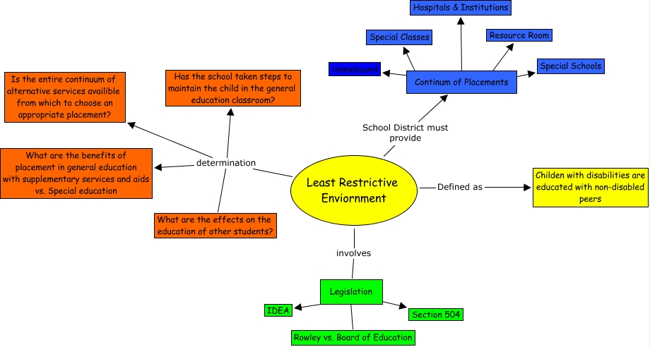 This Concept Map, created with IHMC CmapTools, has information related to: Least Restrictive Enviornment, Least Restrictive Enviornment School District must provide Continum of Placements, Legislation ???? Section 504, Continum of Placements Homebound, Legislation ???? Rowley vs. Board of Education, Least Restrictive Enviornment determination Is the entire continuum of alternative services availible from which to choose an appropriate placement?, Least Restrictive Enviornment involves Legislation, Continum of Placements ???? Special Classes, Least Restrictive Enviornment Defined as Childen with disabilities are educated with non-disabled peers, Continum of Placements ???? Resource Room, Least Restrictive Enviornment determination Has the school taken steps to maintain the child in the general education classroom?, Continum of Placements ???? Hospitals & Institutions, Least Restrictive Enviornment determination What are the benefits of placement in general education with supplementary services and aids vs. Special education, Continum of Placements ???? Special Schools, Least Restrictive Enviornment determination What are the effects on the education of other students?, Legislation ???? IDEA