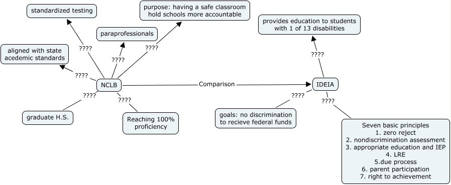 This Concept Map, created with IHMC CmapTools, has information related to: NCLBIDEIA, NCLB ???? standardized testing, IDEIA ???? goals: no discrimination to recieve federal funds, IDEIA ???? Seven basic principles 1. zero reject 2. nondiscrimination assessment 3. appropriate education and IEP 4. LRE 5.due process 6. parent participation 7. right to achievement, NCLB Comparison IDEIA, NCLB ???? purpose: having a safe classroom hold schools more accountable, NCLB ???? aligned with state acedemic standards, IDEIA ???? provides education to students with 1 of 13 disabilities, NCLB ???? Reaching 100% proficiency, NCLB ???? paraprofessionals, NCLB ???? graduate H.S.