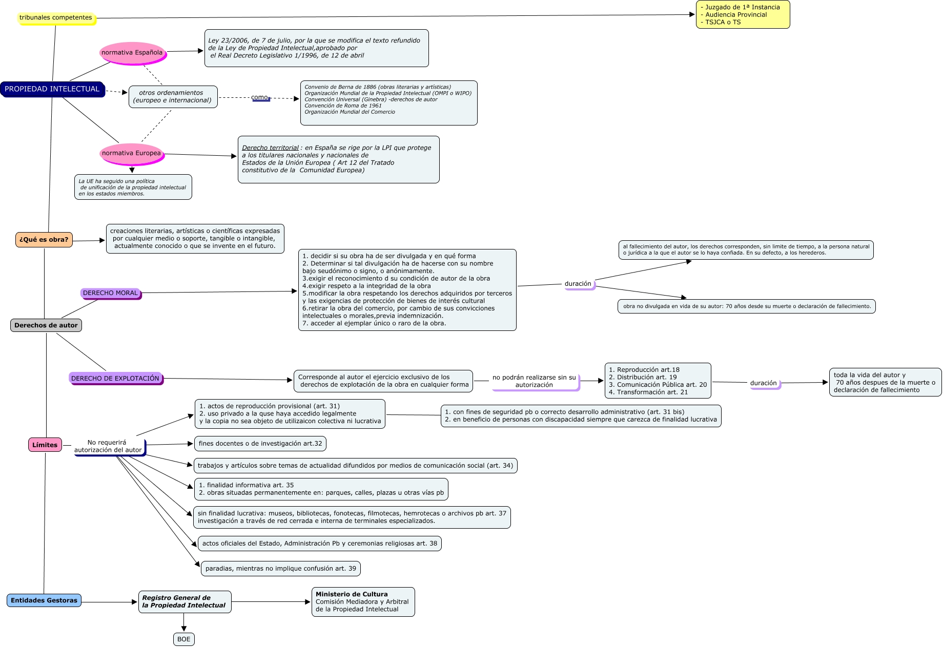 Este Cmap, tiene información relacionada con: PROPIEDAD INTELECTUAL, Registro General de la Propiedad Intelectual ???? Ministerio de Cultura Comisión Mediadora y Arbitral de la Propiedad Intelectual, 1. actos de reproducción provisional (art. 31) 2. uso privado a la quse haya accedido legalmente y la copia no sea objeto de utilizaicon colectiva ni lucrativa ???? 1. con fines de seguridad pb o correcto desarrollo administrativo (art. 31 bis) 2. en beneficio de personas con discapacidad siempre que carezca de finalidad lucrativa, Registro General de la Propiedad Intelectual ???? BOE, PROPIEDAD INTELECTUAL normativa Española Ley 23/2006, de 7 de julio, por la que se modifica el texto refundido de la Ley de Propiedad Intelectual,aprobado por el Real Decreto Legislativo 1/1996, de 12 de abril, Límites No requerirá autorización del autor sin finalidad lucrativa: museos, bibliotecas, fonotecas, filmotecas, hemrotecas o archivos pb art. 37 investigación a través de red cerrada e interna de terminales especializados., Derechos de autor ???? Límites, PROPIEDAD INTELECTUAL normativa Europea otros ordenamientos (europeo e internacional), Derechos de autor DERECHO MORAL 1. decidir si su obra ha de ser divulgada y en qué forma 2. Determinar si tal divulgación ha de hacerse con su nombre bajo seudónimo o signo, o anónimamente. 3.exigir el reconocimiento d su condición de autor de la obra 4.exigir respeto a la integridad de la obra 5.modificar la obra respetando los derechos adquiridos por terceros y las exigencias de protección de bienes de interés cultural 6.retirar la obra del comercio, por cambio de sus convicciones intelectuales o morales,previa indemnización. 7. acceder al ejemplar único o raro de la obra., Límites No requerirá autorización del autor paradias, mientras no implique confusión art. 39, Límites No requerirá autorización del autor fines docentes o de investigación art.32, 1. Reproducción art.18 2. Distribución art. 19 3. Comunicación Pública art. 20 4. Transformación art. 21 duración toda la vida del autor y 70 años despues de la muerte o declaración de fallecimiento, Límites No requerirá autorización del autor 1. finalidad informativa art. 35 2. obras situadas permanentemente en: parques, calles, plazas u otras vías pb, PROPIEDAD INTELECTUAL ???? otros ordenamientos (europeo e internacional), PROPIEDAD INTELECTUAL normativa Europea La UE ha seguido una política de unificación de la propiedad intelectual en los estados miembros., ¿Qué es obra? ???? creaciones literarias, artísticas o científicas expresadas por cualquier medio o soporte, tangible o intangible, actualmente conocido o que se invente en el futuro., 1. decidir si su obra ha de ser divulgada y en qué forma 2. Determinar si tal divulgación ha de hacerse con su nombre bajo seudónimo o signo, o anónimamente. 3.exigir el reconocimiento d su condición de autor de la obra 4.exigir respeto a la integridad de la obra 5.modificar la obra respetando los derechos adquiridos por terceros y las exigencias de protección de bienes de interés cultural 6.retirar la obra del comercio, por cambio de sus convicciones intelectuales o morales,previa indemnización. 7. acceder al ejemplar único o raro de la obra. duración obra no divulgada en vida de su autor: 70 años desde su muerte o declaración de fallecimiento., PROPIEDAD INTELECTUAL normativa Española otros ordenamientos (europeo e internacional), otros ordenamientos (europeo e internacional) como Convenio de Berna de 1886 (obras literarias y artísticas) Organización Mundial de la Propiedad Intelectual (OMPI o WIPO) Convención Universal (Ginebra) -derechos de autor Convención de Roma de 1961 Organización Mundial del Comercio, Límites No requerirá autorización del autor 1. actos de reproducción provisional (art. 31) 2. uso privado a la quse haya accedido legalmente y la copia no sea objeto de utilizaicon colectiva ni lucrativa, PROPIEDAD INTELECTUAL ???? ¿Qué es obra?