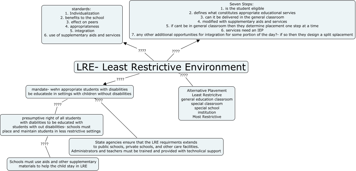 This Concept Map, created with IHMC CmapTools, has information related to: LRE, presumptive right of all students with diabilities to be educated with students with out disabilities- schools must place and maintain students in less restrictive settings ???? Schools must use aids and other supplementary materials to help the child stay in LRE, LRE- Least Restrictive Environment ???? Alternative Plavement Least Restricitve general education classroom special classroom special school institution Most Restrictive, LRE- Least Restrictive Environment ???? mandate- wehn appropriate students with disabilities be educatede in settings with children without disabilities, LRE- Least Restrictive Environment ???? standards: 1. Individualization 2. benefits to the school 3. effect on peers 4. appropriateness 5. integration 6. use of supplementary aids and services, LRE- Least Restrictive Environment ???? Seven Steps: 1. is the student eligible 2. defines what constitutes appropriate educational servies 3. can it be delivered in the general classroom 4. modified with supplementary aids and services 5. if cant be in general classroom then they determine placement one step at a time 6. services need an IEP 7. any other additional opportunities for integration for some portion of the day?- if so then they design a split splacement, mandate- wehn appropriate students with disabilities be educatede in settings with children without disabilities ???? presumptive right of all students with diabilities to be educated with students with out disabilities- schools must place and maintain students in less restrictive settings, mandate- wehn appropriate students with disabilities be educatede in settings with children without disabilities ???? State agencies ensure that the LRE requirments extends to public schools, private schools, and other care facilities. Administrators and teachers must be trained and provided with technolical support