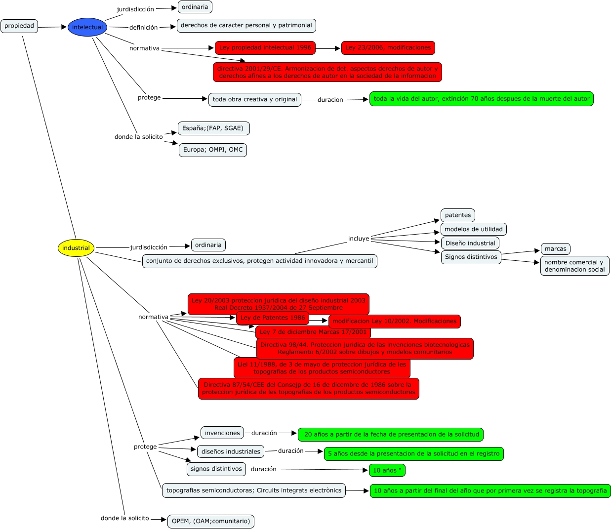 Este Cmap, tiene información relacionada con: Propiedad industrial y intelectual, caso 3-4, Signos distintivos ???? nombre comercial y denominacion social, intelectual donde la solicito Europa; OMPI, OMC, conjunto de derechos exclusivos, protegen actividad innovadora y mercantil incluye Diseño industrial, intelectual definición derechos de caracter personal y patrimonial, conjunto de derechos exclusivos, protegen actividad innovadora y mercantil incluye patentes, industrial normativa Directiva 87/54/CEE del Consejp de 16 de dicembre de 1986 sobre la proteccion jurídica de les topografias de los productos semiconductores, diseños industriales duración 5 años desde la presentacion de la solicitud en el registro, Signos distintivos ???? marcas, intelectual donde la solicito España;(FAP, SGAE), industrial normativa Llei 11/1988, de 3 de mayo de proteccion jurídica de les topografias de los productos semiconductores, toda obra creativa y original duracion toda la vida del autor, extinción 70 años despues de la muerte del autor, industrial definición conjunto de derechos exclusivos, protegen actividad innovadora y mercantil, Ley de Patentes 1986 ???? modificacion Ley 10/2002. Modificaciones, signos distintivos duración 10 años ", propiedad intelectual, industrial normativa Directiva 87/54/CEE del Consejp de 16 de dicembre de 1986 sobre la proteccion jurídica de les topografias de los productos semiconductores, intelectual normativa directiva 2001/29/CE. Armonizacion de det. aspectos derechos de autor y derechos afines a los derechos de autor en la sociedad de la informacion, industrial donde la solicito OPEM, (OAM;comunitario), intelectual normativa Ley propiedad intelectual 1996, industrial normativa Ley 7 de diciembre Marcas 17/2001