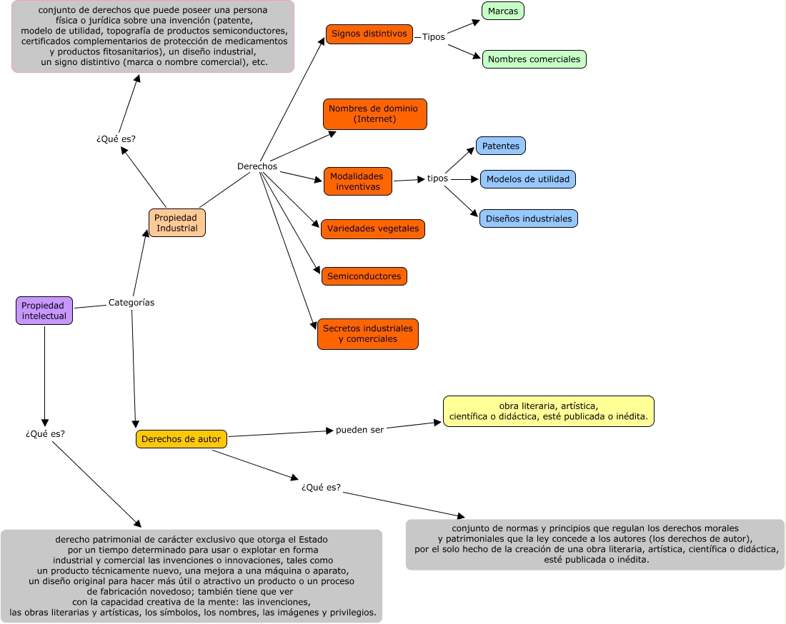 Este Cmap, tiene información relacionada con: Propiedad intelectual, Propiedad intelectual Categorías Propiedad Industrial, Propiedad Industrial Derechos Semiconductores, Propiedad intelectual ¿Qué es? derecho patrimonial de carácter exclusivo que otorga el Estado por un tiempo determinado para usar o explotar en forma industrial y comercial las invenciones o innovaciones, tales como un producto técnicamente nuevo, una mejora a una máquina o aparato, un diseño original para hacer más útil o atractivo un producto o un proceso de fabricación novedoso; también tiene que ver con la capacidad creativa de la mente: las invenciones, las obras literarias y artísticas, los símbolos, los nombres, las imágenes y privilegios., Modalidades inventivas tipos Modelos de utilidad, Propiedad Industrial Derechos Signos distintivos, Propiedad Industrial Derechos Variedades vegetales, Propiedad intelectual Categorías Derechos de autor, Propiedad Industrial Derechos Secretos industriales y comerciales, Signos distintivos Tipos Nombres comerciales, Derechos de autor pueden ser obra literaria, artística, científica o didáctica, esté publicada o inédita., Propiedad Industrial Derechos Nombres de dominio (Internet), Modalidades inventivas tipos Diseños industriales, Signos distintivos Tipos Marcas, Propiedad Industrial ¿Qué es? conjunto de derechos que puede poseer una persona física o jurídica sobre una invención (patente, modelo de utilidad, topografía de productos semiconductores, certificados complementarios de protección de medicamentos y productos fitosanitarios), un diseño industrial, un signo distintivo (marca o nombre comercial), etc., Modalidades inventivas tipos Patentes, Derechos de autor ¿Qué es? conjunto de normas y principios que regulan los derechos morales y patrimoniales que la ley concede a los autores (los derechos de autor), por el solo hecho de la creación de una obra literaria, artística, científica o didáctica, esté publicada o inédita., Propiedad Industrial Derechos Modalidades inventivas