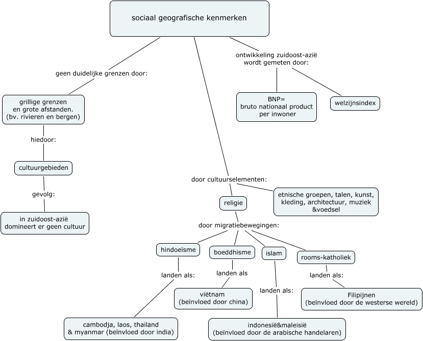 Deze Concept Map heeft informatie gerelateerd aan: paragraaf 4, religie door migratiebewegingen: boeddhisme, religie door migratiebewegingen: islam, sociaal geografische kenmerken ontwikkeling zuidoost-azië wordt gemeten door: welzijnsindex, sociaal geografische kenmerken ontwikkeling zuidoost-azië wordt gemeten door: BNP= bruto nationaal product per inwoner, rooms-katholiek landen als: Filipijnen (beïnvloed door de westerse wereld), sociaal geografische kenmerken door cultuurselementen: religie, sociaal geografische kenmerken geen duidelijke grenzen door: grillige grenzen en grote afstanden. (bv. rivieren en bergen), etnische groepen, talen, kunst, kleding, architectuur, muziek &voedsel door cultuurselementen: religie, cultuurgebieden gevolg: in zuidoost-azië domineert er geen cultuur, hindoeïsme landen als: cambodja, laos, thailand & myanmar (beïnvloed door india), grillige grenzen en grote afstanden. (bv. rivieren en bergen) hiedoor: cultuurgebieden, religie door migratiebewegingen: hindoeïsme, islam landen als: indonesië&maleisië (beïnvloed door de arabische handelaren), religie door migratiebewegingen: rooms-katholiek, boeddhisme landen als viëtnam (beïnvloed door china)
