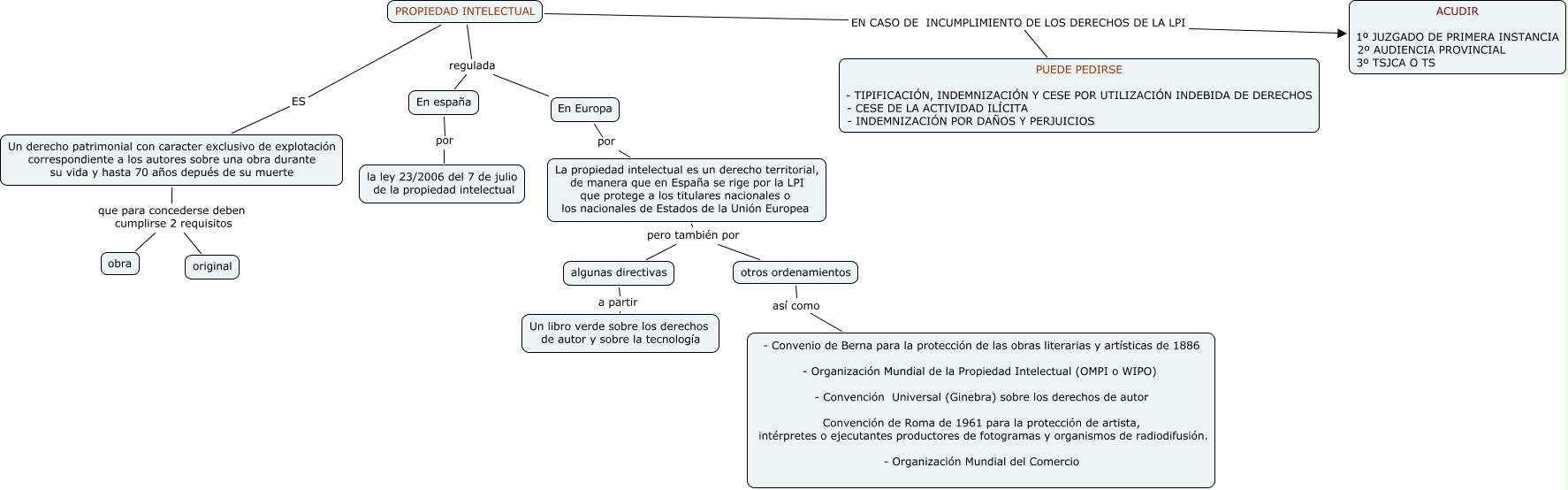 Este Cmap, tiene información relacionada con: PROPIEDAD INTELECTUAL, otros ordenamientos así como - Convenio de Berna para la protección de las obras literarias y artísticas de 1886 - Organización Mundial de la Propiedad Intelectual (OMPI o WIPO) - Convención Universal (Ginebra) sobre los derechos de autor Convención de Roma de 1961 para la protección de artista, intérpretes o ejecutantes productores de fotogramas y organismos de radiodifusión. - Organización Mundial del Comercio, La propiedad intelectual es un derecho territorial, de manera que en España se rige por la LPI que protege a los titulares nacionales o los nacionales de Estados de la Unión Europea pero también por otros ordenamientos, En Europa por La propiedad intelectual es un derecho territorial, de manera que en España se rige por la LPI que protege a los titulares nacionales o los nacionales de Estados de la Unión Europea, algunas directivas a partir Un libro verde sobre los derechos de autor y sobre la tecnología, La propiedad intelectual es un derecho territorial, de manera que en España se rige por la LPI que protege a los titulares nacionales o los nacionales de Estados de la Unión Europea pero también por algunas directivas, PROPIEDAD INTELECTUAL regulada En españa, PROPIEDAD INTELECTUAL regulada En Europa, PROPIEDAD INTELECTUAL EN CASO DE INCUMPLIMIENTO DE LOS DERECHOS DE LA LPI ACUDIR 1º JUZGADO DE PRIMERA INSTANCIA 2º AUDIENCIA PROVINCIAL 3º TSJCA O TS, Un derecho patrimonial con caracter exclusivo de explotación correspondiente a los autores sobre una obra durante su vida y hasta 70 años depués de su muerte que para concederse deben cumplirse 2 requisitos obra, PROPIEDAD INTELECTUAL ES Un derecho patrimonial con caracter exclusivo de explotación correspondiente a los autores sobre una obra durante su vida y hasta 70 años depués de su muerte, PROPIEDAD INTELECTUAL EN CASO DE INCUMPLIMIENTO DE LOS DERECHOS DE LA LPI PUEDE PEDIRSE - TIPIFICACIÓN, INDEMNIZACIÓN Y CESE POR UTILIZACIÓN INDEBIDA DE DERECHOS - CESE DE LA ACTIVIDAD ILÍCITA - INDEMNIZACIÓN POR DAÑOS Y PERJUICIOS, Un derecho patrimonial con caracter exclusivo de explotación correspondiente a los autores sobre una obra durante su vida y hasta 70 años depués de su muerte que para concederse deben cumplirse 2 requisitos original, En españa por la ley 23/2006 del 7 de julio de la propiedad intelectual