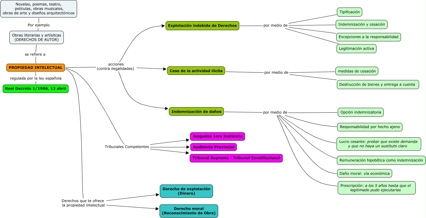Este Cmap, tiene información relacionada con: Cmap3 (Propiedad intelectual), Indemnización de daños por medio de Lucro cesante: probar que existe demanda y que no haya un sustituto claro, PROPIEDAD INTELECTUAL Derechos que te ofrece la propiedad intelectual Derecho moral (Reconocimiento de Obra), Cese de la actividad ilícita por medio de medidas de cesación, Indemnización de daños por medio de Daño moral: vía económica, Cese de la actividad ilícita por medio de Destrucción de bienes y entrega a cuenta, PROPIEDAD INTELECTUAL acciones (contra ilegalidades) Explotación indebida de Derechos, PROPIEDAD INTELECTUAL Tribunales Competentes Audiencia Provincial, PROPIEDAD INTELECTUAL acciones (contra ilegalidades) Indemnización de daños, Indemnización de daños por medio de Responsabilidad por hecho ajeno, Explotación indebida de Derechos por medio de Tipificación, PROPIEDAD INTELECTUAL Tribunales Competentes Juzgados 1era Instancia, PROPIEDAD INTELECTUAL Tribunales Competentes Tribunal Supremo - Tribunal Constitucional, Explotación indebida de Derechos por medio de Indemnización y cesación, Obras literarias y artísitcas (DERECHOS DE AUTOR) Por ejemplo Novelas, poemas, teatro, películas, obras musicales, obras de arte y diseños arquitectónicos, Indemnización de daños por medio de Prescripción: a los 5 años hasta que el legitimado pudo ejecutarlas, Indemnización de daños por medio de Remuneración hipotética como indemnización, Indemnización de daños por medio de Opción indemnizatoria, Explotación indebida de Derechos por medio de Legitimación activa, PROPIEDAD INTELECTUAL se refiere a Obras literarias y artísitcas (DERECHOS DE AUTOR), PROPIEDAD INTELECTUAL Derechos que te ofrece la propiedad intelectual Derecho de explotación (Dinero)
