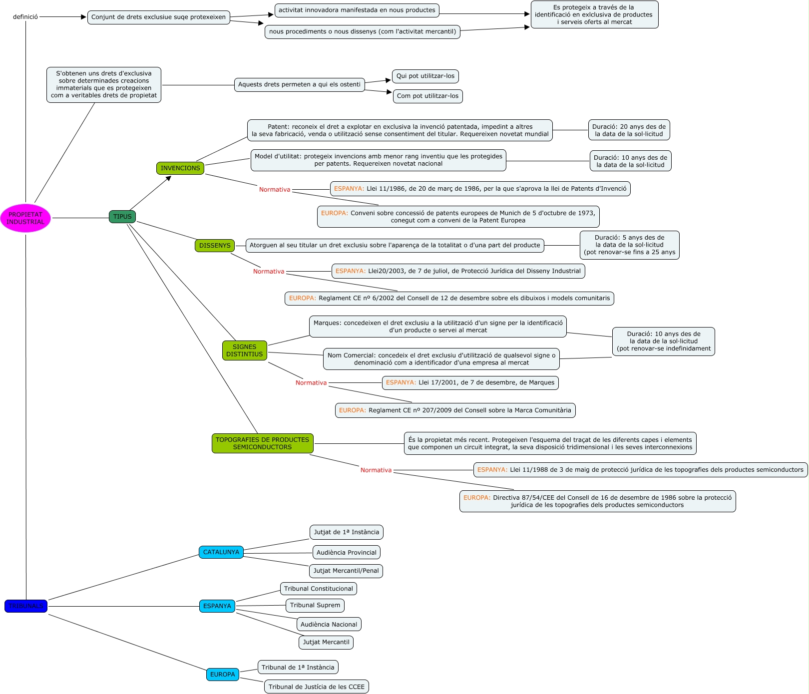 Este Cmap, tiene información relacionada con: mapa conceptual 4 regim juridic, Atorguen al seu titular un dret exclusiu sobre l'aparença de la totalitat o d'una part del producte ???? Duració: 5 anys des de la data de la sol·licitud (pot renovar-se fins a 25 anys, SIGNES DISTINTIUS Normativa ESPANYA: Llei 17/2001, de 7 de desembre, de Marques, EUROPA ???? Tribunal de Justícia de les CCEE, Aquests drets permeten a qui els ostenti ???? Qui pot utilitzar-los, nous procediments o nous dissenys (com l'activitat mercantil) ???? Es protegeix a través de la identificació en exlclusiva de productes i serveis oferts al mercat, Patent: reconeix el dret a explotar en exclusiva la invenció patentada, impedint a altres la seva fabricació, venda o utilització sense consentiment del titular. Requereixen novetat mundial ???? Duració: 20 anys des de la data de la sol·licitud, TRIBUNALS ???? EUROPA, TOPOGRAFIES DE PRODUCTES SEMICONDUCTORS ???? És la propietat més recent. Protegeixen l'esquema del traçat de les diferents capes i elements que componen un circuit integrat, la seva disposició tridimensional i les seves interconnexions, Marques: concedeixen el dret exclusiu a la utilització d'un signe per la identificació d'un producte o servei al mercat ???? Duració: 10 anys des de la data de la sol·licitud (pot renovar-se indefinidament, TRIBUNALS ???? CATALUNYA, CATALUNYA ???? Jutjat de 1ª Instància, PROPIETAT INDUSTRIAL ???? TRIBUNALS, ESPANYA ???? Audiència Nacional, PROPIETAT INDUSTRIAL ???? S'obtenen uns drets d'exclusiva sobre determinades creacions immaterials que es protegeixen com a veritables drets de propietat, DISSENYS Normativa EUROPA: Reglament CE nº 6/2002 del Consell de 12 de desembre sobre els dibuixos i models comunitaris, DISSENYS ???? Atorguen al seu titular un dret exclusiu sobre l'aparença de la totalitat o d'una part del producte, TOPOGRAFIES DE PRODUCTES SEMICONDUCTORS Normativa EUROPA: Directiva 87/54/CEE del Consell de 16 de desembre de 1986 sobre la protecció jurídica de les topografies dels productes semiconductors, CATALUNYA ???? Jutjat Mercantil/Penal, TIPUS ???? TOPOGRAFIES DE PRODUCTES SEMICONDUCTORS, CATALUNYA ???? Audiència Provincial