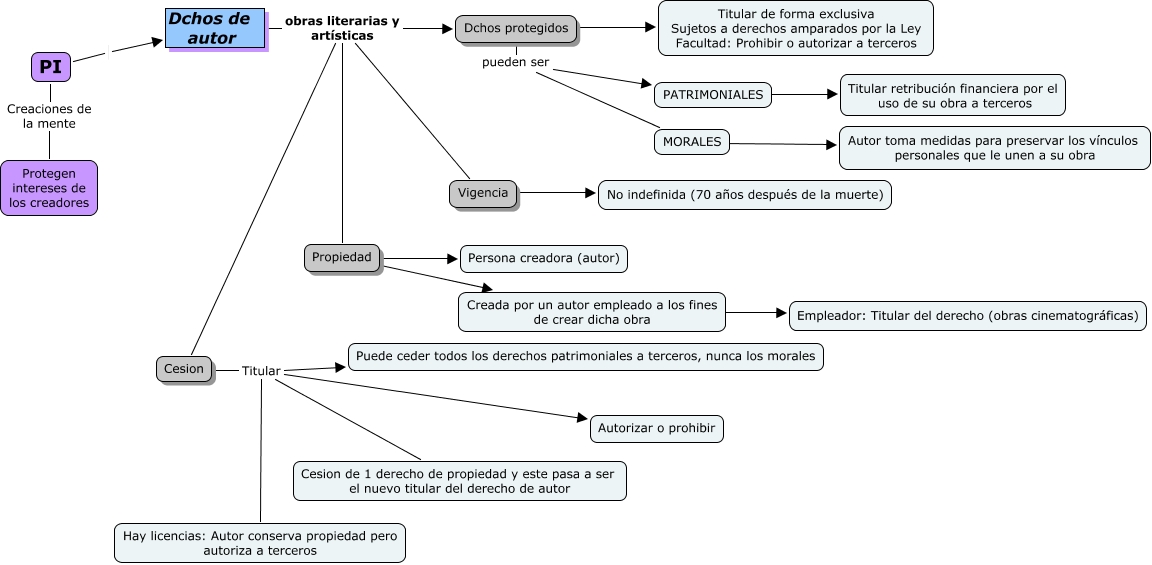 Este Cmap, tiene información relacionada con: tema 3, PATRIMONIALES ???? Titular retribución financiera por el uso de su obra a terceros, Dchos de autor obras literarias y artísticas Cesion, PI Creaciones de la mente Protegen intereses de los creadores, Dchos protegidos pueden ser PATRIMONIALES, Dchos de autor obras literarias y artísticas Dchos protegidos, Cesion Titular Autorizar o prohibir, PI Dchos de autor, Cesion Titular Cesion de 1 derecho de propiedad y este pasa a ser el nuevo titular del derecho de autor, Propiedad ???? Persona creadora (autor), Dchos protegidos ???? Titular de forma exclusiva Sujetos a derechos amparados por la Ley Facultad: Prohibir o autorizar a terceros, MORALES ???? Autor toma medidas para preservar los vínculos personales que le unen a su obra, Cesion Titular Puede ceder todos los derechos patrimoniales a terceros, nunca los morales, Cesion Titular Hay licencias: Autor conserva propiedad pero autoriza a terceros, Dchos de autor obras literarias y artísticas Vigencia, Dchos protegidos pueden ser MORALES, Propiedad ???? Creada por un autor empleado a los fines de crear dicha obra, Vigencia ???? No indefinida (70 años después de la muerte), Creada por un autor empleado a los fines de crear dicha obra ???? Empleador: Titular del derecho (obras cinematográficas), Dchos de autor obras literarias y artísticas Propiedad