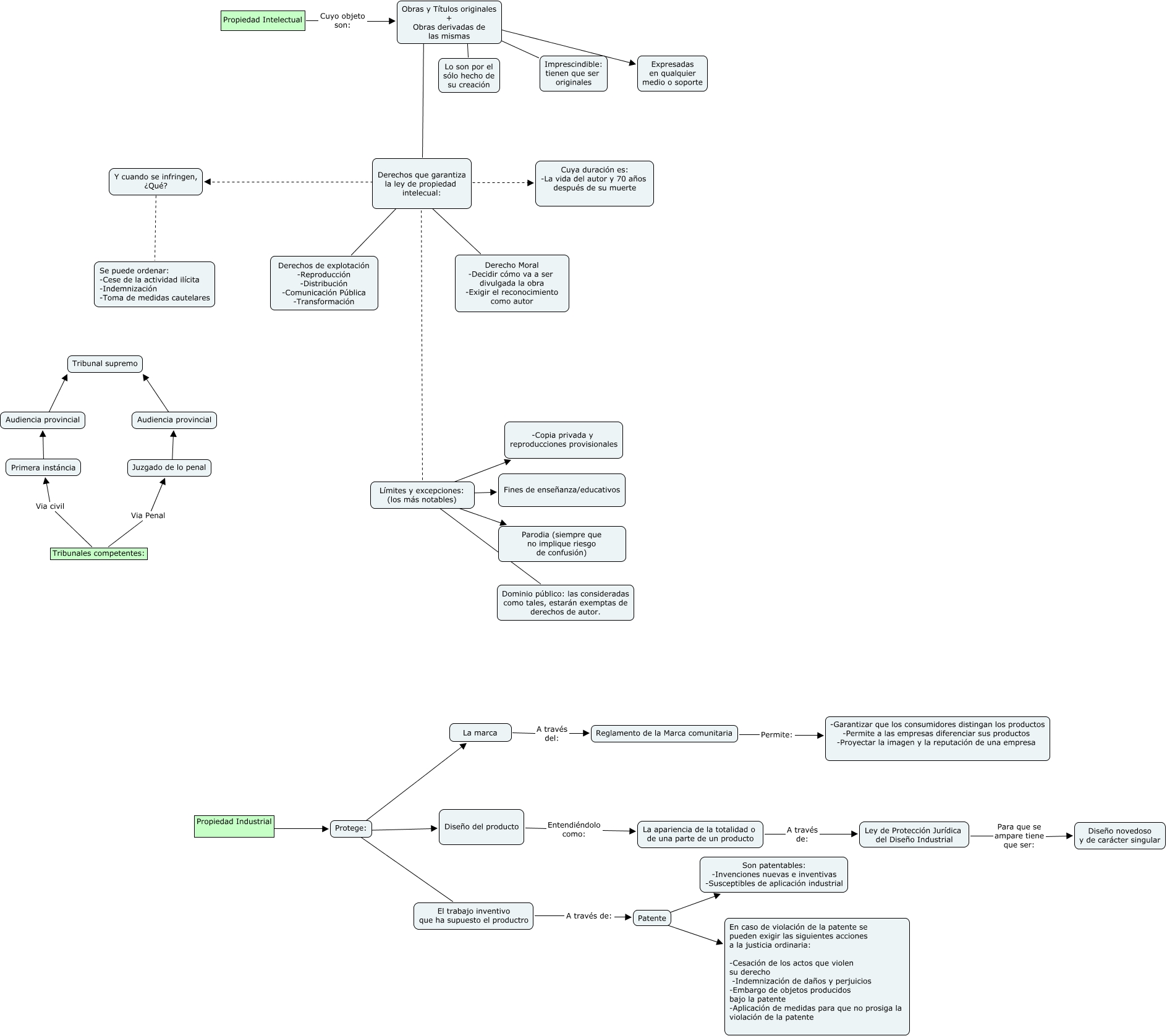 Este Cmap, tiene información relacionada con: terceroycuarto caso, Juzgado de lo penal ???? Audiencia provincial, Reglamento de la Marca comunitaria Permite: -Garantizar que los consumidores distingan los productos -Permite a las empresas diferenciar sus productos -Proyectar la imagen y la reputación de una empresa , Obras y Títulos originales + Obras derivadas de las mismas ???? Lo son por el sólo hecho de su creación, Límites y excepciones: (los más notables) ???? Fines de enseñanza/educativos, Audiencia provincial ???? Tribunal supremo, Diseño del producto Entendiéndolo como: La apariencia de la totalidad o de una parte de un producto, Obras y Títulos originales + Obras derivadas de las mismas ???? Imprescindible: tienen que ser originales, Tribunales competentes: Via civil Primera instáncia, Derechos que garantiza la ley de propiedad intelecual: ???? Y cuando se infringen, ¿Qué?, Derechos que garantiza la ley de propiedad intelecual: ???? Derechos de explotación -Reproducción -Distribución -Comunicación Pública -Transformación, Patente ???? Son patentables: -Invenciones nuevas e inventivas -Susceptibles de aplicación industrial, Derechos que garantiza la ley de propiedad intelecual: ???? Derecho Moral -Decidir cómo va a ser divulgada la obra -Exigir el reconocimiento como autor, Obras y Títulos originales + Obras derivadas de las mismas ???? Expresadas en qualquier medio o soporte, Primera instáncia Luego Audiencia provincial, Y cuando se infringen, ¿Qué? ???? Se puede ordenar: -Cese de la actividad ilícita -Indemnización -Toma de medidas cautelares, La marca A través del: Reglamento de la Marca comunitaria, La apariencia de la totalidad o de una parte de un producto A través de: Ley de Protección Jurídica del Diseño Industrial, Obras y Títulos originales + Obras derivadas de las mismas ???? Derechos que garantiza la ley de propiedad intelecual:, Tribunales competentes: Via Penal Juzgado de lo penal, Propiedad Intelectual Cuyo objeto son: Obras y Títulos originales + Obras derivadas de las mismas