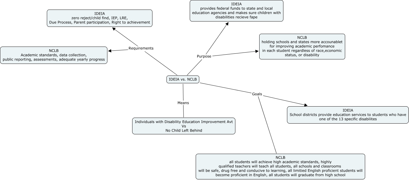 This Concept Map, created with IHMC CmapTools, has information related to: IDEIA vs NCLB, IDEIA vs. NCLB Purpose IDEIA provides federal funds to state and local education agencies and makes sure children with disabilities recieve fape, IDEIA vs. NCLB Goals IDEIA School districts provide education services to students who have one of the 13 specific disabilites, IDEIA vs. NCLB Requirements NCLB Academic standards, data collection, public reporting, assessments, adequate yearly progress, IDEIA vs. NCLB Goals NCLB all students will achieve high academic standards, highly qualified teachers will teach all students, all schools and classrooms will be safe, drug free and conducive to learning, all limitied English proficient students will become proficient in English, all students will graduate from high school, IDEIA vs. NCLB Purpose NCLB holding schools and states more accounablet for improving academic perfomance in each student regardless of race,economic status, or disability, IDEIA vs. NCLB Requirements IDEIA zero reject/child find, IEP, LRE, Due Process, Parent participation, Right to achievement, IDEIA vs. NCLB Means Individuals with Disability Education Improvement Avt Vs No Child Left Behind