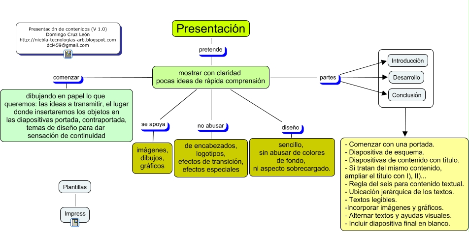 Este Cmap, tiene información relacionada con: Presentación de contenidos I, mostrar con claridad pocas ideas de rápida comprensión no abusar de encabezados, logotipos, efectos de transición, efectos especiales, Plantillas Impress, - Comenzar con una portada. - Diapositiva de esquema. - Diapositivas de contenido con título. - Si tratan del mismo contenido, ampliar el título con I), II)... - Regla del seis para contenido textual. - Ubicación jerárquica de los textos. - Textos legibles. -Incorporar imágenes y gráficos. - Alternar textos y ayudas visuales. - Incluir diapositiva final en blanco., Presentación pretende mostrar con claridad pocas ideas de rápida comprensión, mostrar con claridad pocas ideas de rápida comprensión diseño sencillo, sin abusar de colores de fondo, ni aspecto sobrecargado., mostrar con claridad pocas ideas de rápida comprensión comenzar dibujando en papel lo que queremos: las ideas a transmitir, el lugar donde insertaremos los objetos en las diapositivas portada, contraportada, temas de diseño para dar sensación de continuidad, mostrar con claridad pocas ideas de rápida comprensión partes Desarrollo, mostrar con claridad pocas ideas de rápida comprensión se apoya imágenes, dibujos, gráficos, mostrar con claridad pocas ideas de rápida comprensión partes Introducción, mostrar con claridad pocas ideas de rápida comprensión partes Conclusión