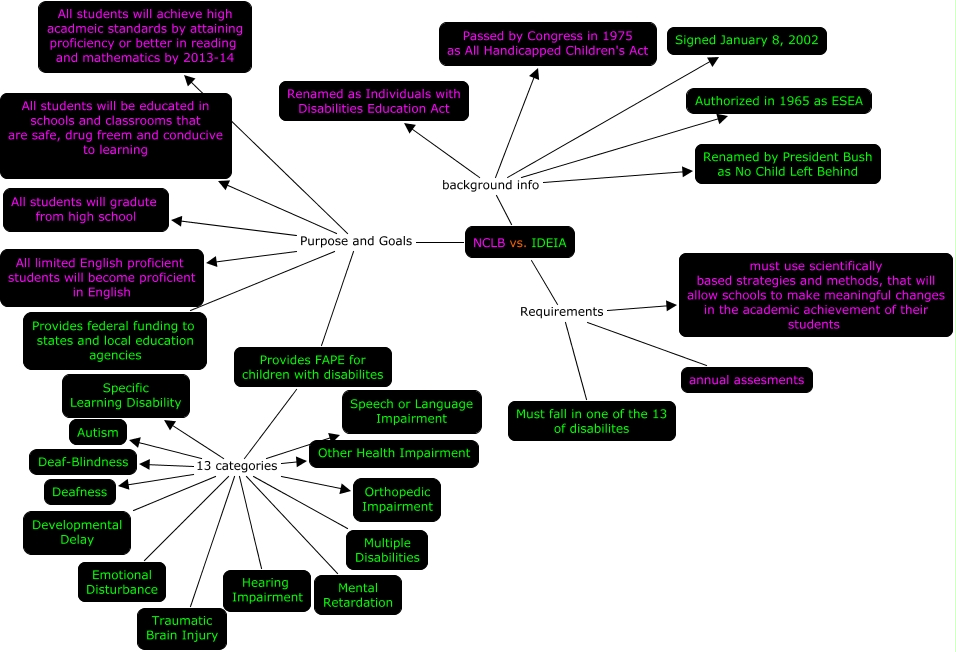 This Concept Map, created with IHMC CmapTools, has information related to: IDEIA NCLB, Provides FAPE for children with disabilites 13 categories Other Health Impairment, NCLB vs. IDEIA Purpose and Goals All students will be educated in schools and classrooms that are safe, drug freem and conducive to learning, Provides FAPE for children with disabilites 13 categories Deafness, NCLB vs. IDEIA Purpose and Goals All students will gradute from high school, NCLB vs. IDEIA Requirements must use scientifically based strategies and methods, that will allow schools to make meaningful changes in the academic achievement of their students, NCLB vs. IDEIA Purpose and Goals All students will achieve high acadmeic standards by attaining proficiency or better in reading and mathematics by 2013-14, NCLB vs. IDEIA Purpose and Goals Provides FAPE for children with disabilites, Provides FAPE for children with disabilites 13 categories Autism, NCLB vs. IDEIA Requirements Must fall in one of the 13 of disabilites, Provides FAPE for children with disabilites 13 categories Developmental Delay, NCLB vs. IDEIA background info Renamed by President Bush as No Child Left Behind, Provides FAPE for children with disabilites 13 categories Multiple Disabilities, Provides FAPE for children with disabilites 13 categories Emotional Disturbance, NCLB vs. IDEIA Requirements annual assesments, Provides FAPE for children with disabilites 13 categories Specific Learning Disability, NCLB vs. IDEIA background info Authorized in 1965 as ESEA, Provides FAPE for children with disabilites 13 categories Traumatic Brain Injury, NCLB vs. IDEIA background info Renamed as Individuals with Disabilities Education Act, NCLB vs. IDEIA background info Passed by Congress in 1975 as All Handicapped Children's Act, Provides FAPE for children with disabilites 13 categories Mental Retardation
