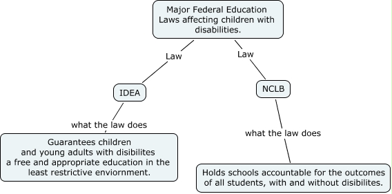 This Concept Map, created with IHMC CmapTools, has information related to: IDEA NCLB, IDEA what the law does Guarantees children and young adults with disibilites a free and appropriate education in the least restrictive enviornment., NCLB what the law does Holds schools accountable for the outcomes of all students, with and without disibilites., Major Federal Education Laws affecting children with disabilities. Law NCLB, Major Federal Education Laws affecting children with disabilities. Law IDEA