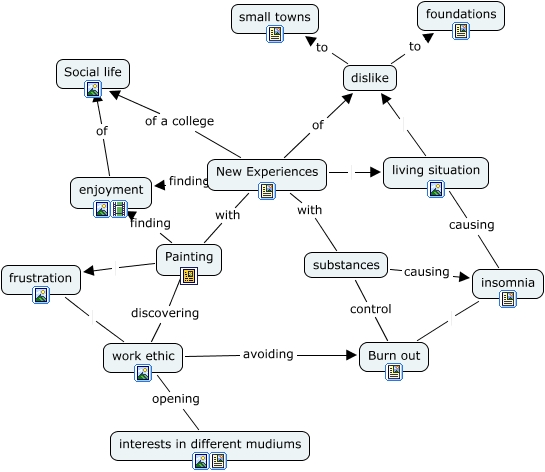 This Concept Map, created with IHMC CmapTools, has information related to: Evans Cmap, New Experiences with substances, Painting finding enjoyment, New Experiences living situation, living situation dislike, enjoyment of Social life, New Experiences of a college Social life, substances causing insomnia, New Experiences finding enjoyment, living situation causing insomnia, dislike to small towns, New Experiences with Painting, work ethic opening interests in different mudiums, New Experiences of dislike, Painting frustration, dislike to foundations, insomnia Burn out, work ethic avoiding Burn out, frustration work ethic, Painting discovering work ethic, substances control Burn out