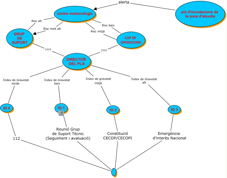 Este Cmap, tiene información relacionada con: INUNDACIONS, IG 0 112, centre meteorologic Risc mitjà CAP DE OPERACIONS, DIRECTOR DEL PLA Índex de Gravetat alt IG 3, DIRECTOR DEL PLA Índex de gravetat mitjà IG 2, GRUP DE SUPORT ???? DIRECTOR DEL PLA, centre meteorologic Risc molt alt GRUP DE SUPORT, centre meteorologic Risc baix CAP DE OPERACIONS, centre meteorologic Risc alt GRUP DE SUPORT, CAP DE OPERACIONS ???? DIRECTOR DEL PLA, IG 1 Reunió Grup de Suport Tècnic (Seguiment i avaluació), DIRECTOR DEL PLA Índex de Gravetat escàs IG 0, DIRECTOR DEL PLA Índex de Gravetat baix IG 1, pla d'inundacions de la zona d'alcudia alerta centre meteorologic, IG 2 Constitució CECOP/CECOPI, IG 3 Emergència d’interès Nacional