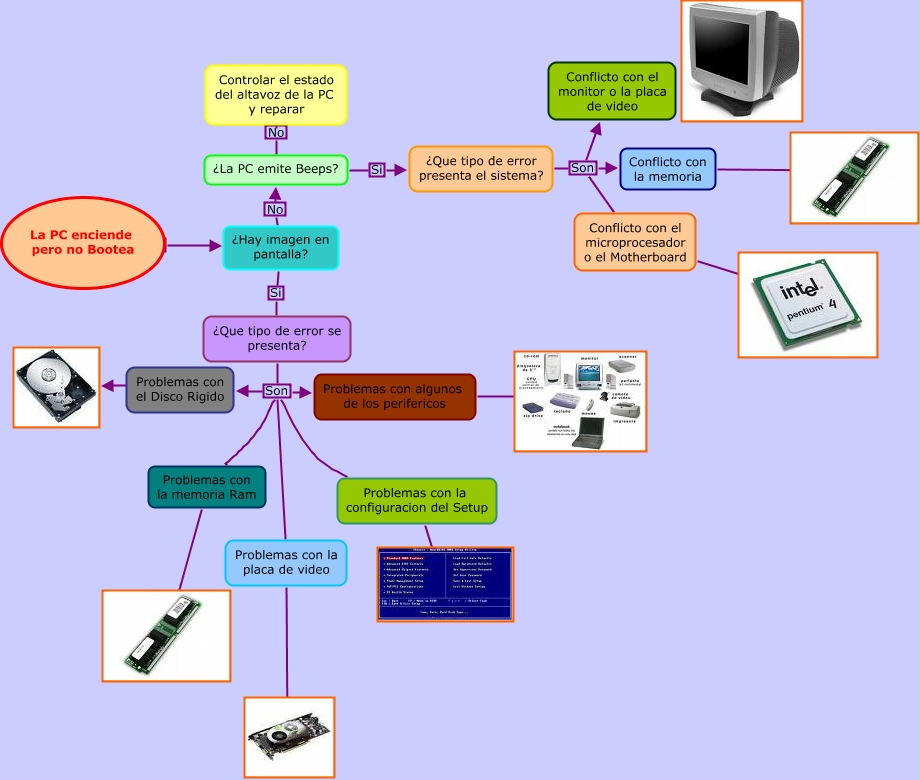 Este Cmap, tiene información relacionada con: La PC no Bootea.cmap, ¿La PC emite Beeps? No Controlar el estado del altavoz de la PC y reparar, ¿Hay imagen en pantalla? Si ¿Que tipo de error se presenta?, Conflicto con la memoria ????, ¿Que tipo de error se presenta? Son Problemas con el Disco Rigido, ¿Que tipo de error presenta el sistema? Son Conflicto con la memoria, ¿Que tipo de error presenta el sistema? Son Conflicto con el microprocesador o el Motherboard, La PC enciende pero no Bootea ???? ????, Problemas con el Disco Rigido ????, ¿La PC emite Beeps? Si ¿Que tipo de error presenta el sistema?, ¿Que tipo de error se presenta? Son Problemas con la configuracion del Setup, Problemas con la memoria Ram ????, Problemas con algunos de los perifericos ????, ¿Que tipo de error se presenta? Son Problemas con la memoria Ram, ¿Que tipo de error se presenta? Son Problemas con la placa de video, ¿Hay imagen en pantalla? No ¿La PC emite Beeps?, Problemas con la placa de video ????, ¿Que tipo de error presenta el sistema? Son Conflicto con el monitor o la placa de video, ¿Que tipo de error se presenta? Son Problemas con algunos de los perifericos, Problemas con la configuracion del Setup ????, Conflicto con el microprocesador o el Motherboard ????