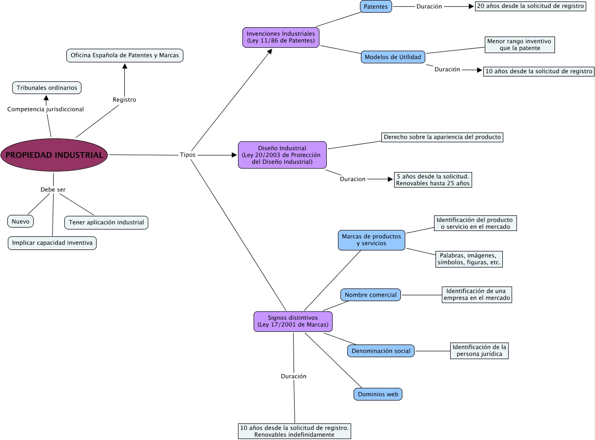 Este Cmap, tiene información relacionada con: Caso 4 REVISADO, PROPIEDAD INDUSTRIAL Debe ser Implicar capacidad inventiva, Modelos de Utilidad ???? Menor rango inventivo que la patente, Signos distintivos (Ley 17/2001 de Marcas) ???? Marcas de productos y servicios, PROPIEDAD INDUSTRIAL Tipos Invenciones Industriales (Ley 11/86 de Patentes), PROPIEDAD INDUSTRIAL Tipos Signos distintivos (Ley 17/2001 de Marcas), PROPIEDAD INDUSTRIAL Registro Oficina Española de Patentes y Marcas, Denominación social ???? Identificación de la persona jurídica, Signos distintivos (Ley 17/2001 de Marcas) Duración 10 años desde la solicitud de registro. Renovables indefinidamente, Patentes Duración 20 años desde la solicitud de registro, Marcas de productos y servicios ???? Palabras, imágenes, símbolos, figuras, etc., Nombre comercial ???? Identificación de una empresa en el mercado, Modelos de Utilidad Duración 10 años desde la solicitud de registro, PROPIEDAD INDUSTRIAL Debe ser Nuevo, Invenciones Industriales (Ley 11/86 de Patentes) ???? Modelos de Utilidad, Marcas de productos y servicios ???? Identificación del producto o servicio en el mercado, PROPIEDAD INDUSTRIAL Debe ser Tener aplicación industrial, PROPIEDAD INDUSTRIAL Competencia jurisdiccional Tribunales ordinarios, Diseño Industrial (Ley 20/2003 de Protección del Diseño Industrial) ???? Derecho sobre la apariencia del producto, Invenciones Industriales (Ley 11/86 de Patentes) ???? Patentes, Signos distintivos (Ley 17/2001 de Marcas) ???? Nombre comercial