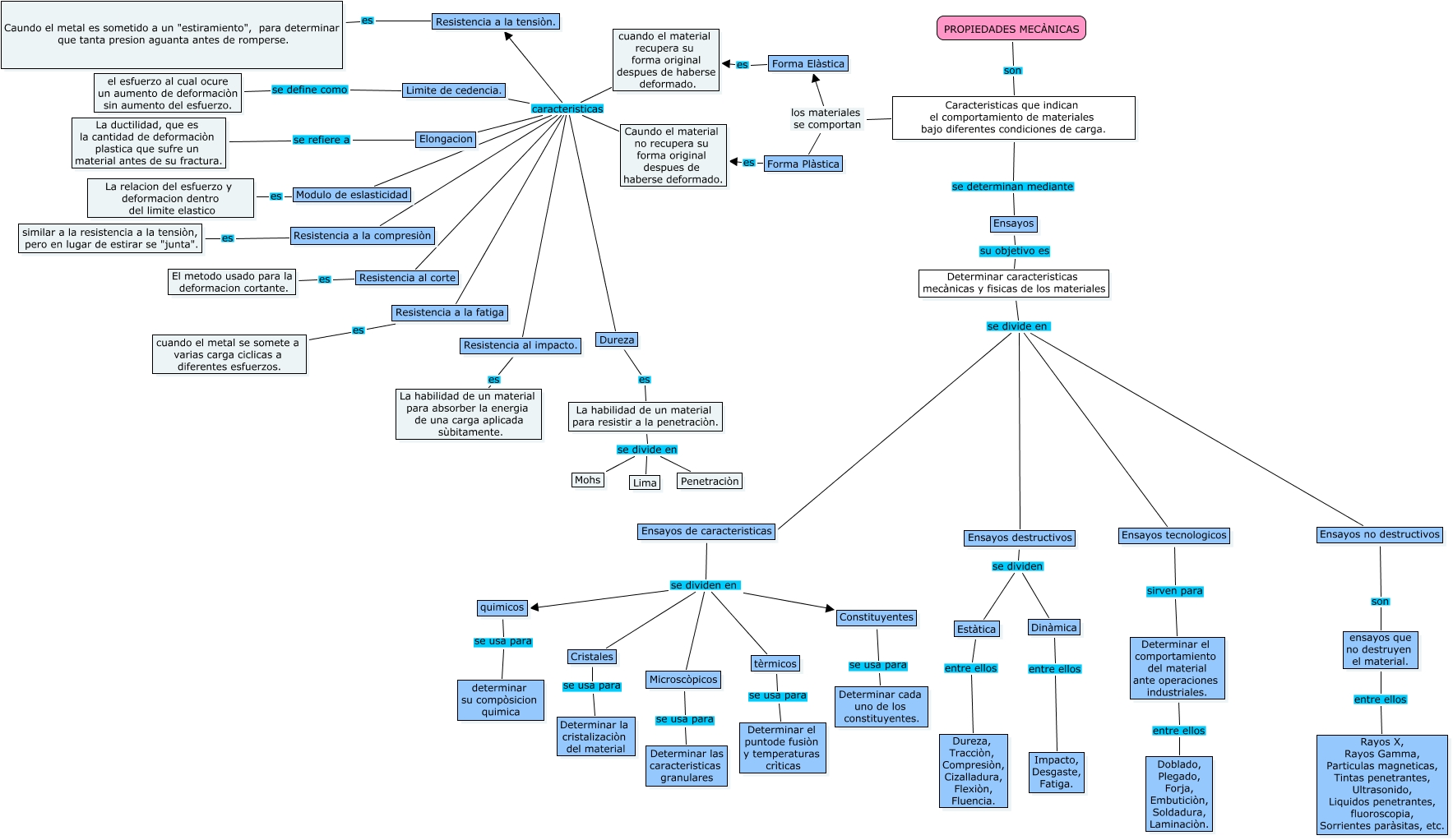 Este Cmap, tiene información relacionada con: PROPIEDADES MECANICAS, ensayos que no destruyen el material. entre ellos Rayos X, Rayos Gamma, Particulas magneticas, Tintas penetrantes, Ultrasonido, Liquidos penetrantes, fluoroscopia, Sorrientes paràsitas, etc., Caundo el material no recupera su forma original despues de haberse deformado. caracteristicas Resistencia a la fatiga, Caundo el material no recupera su forma original despues de haberse deformado. caracteristicas Dureza, Forma Elàstica es cuando el material recupera su forma original despues de haberse deformado., Resistencia al impacto. es La habilidad de un material para absorber la energia de una carga aplicada sùbitamente., cuando el material recupera su forma original despues de haberse deformado. caracteristicas Limite de cedencia., Caracteristicas que indican el comportamiento de materiales bajo diferentes condiciones de carga. se determinan mediante Ensayos, Caracteristicas que indican el comportamiento de materiales bajo diferentes condiciones de carga. los materiales se comportan Forma Elàstica, La habilidad de un material para resistir a la penetraciòn. se divide en Penetraciòn, Cristales se usa para Determinar la cristalizaciòn del material, Caracteristicas que indican el comportamiento de materiales bajo diferentes condiciones de carga. los materiales se comportan Forma Plàstica, Microscòpicos se usa para Determinar las caracteristicas granulares, Ensayos tecnologicos sirven para Determinar el comportamiento del material ante operaciones industriales., quimicos se usa para determinar su compòsicion quimica, Resistencia al corte es El metodo usado para la deformacion cortante., PROPIEDADES MECÀNICAS son Caracteristicas que indican el comportamiento de materiales bajo diferentes condiciones de carga., Resistencia a la fatiga es cuando el metal se somete a varias carga ciclicas a diferentes esfuerzos., Elongacion se refiere a La ductilidad, que es la cantidad de deformaciòn plastica que sufre un material antes de su fractura., cuando el material recupera su forma original despues de haberse deformado. caracteristicas Resistencia a la tensiòn., Resistencia a la compresiòn es similar a la resistencia a la tensiòn, pero en lugar de estirar se "junta".