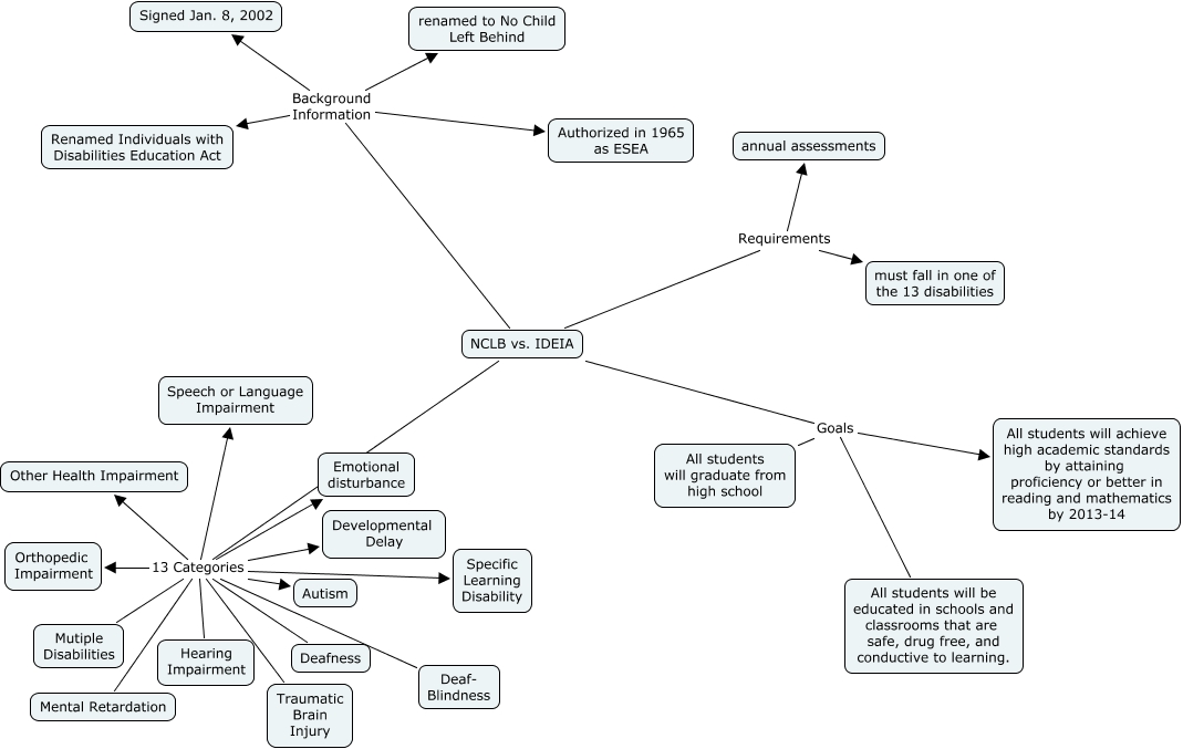 This Concept Map, created with IHMC CmapTools, has information related to: Jennifer Cottrell IDEIA NCLB, NCLB vs. IDEIA 13 Categories Traumatic Brain Injury, NCLB vs. IDEIA 13 Categories Developmental Delay, NCLB vs. IDEIA Requirements must fall in one of the 13 disabilities, NCLB vs. IDEIA 13 Categories Emotional disturbance, NCLB vs. IDEIA 13 Categories Other Health Impairment, NCLB vs. IDEIA 13 Categories Specific Learning Disability, NCLB vs. IDEIA Requirements annual assessments, NCLB vs. IDEIA 13 Categories Mutiple Disabilities, NCLB vs. IDEIA 13 Categories Hearing Impairment, NCLB vs. IDEIA 13 Categories Orthopedic Impairment, NCLB vs. IDEIA Goals All students will be educated in schools and classrooms that are safe, drug free, and conductive to learning., NCLB vs. IDEIA 13 Categories Mental Retardation, NCLB vs. IDEIA 13 Categories Autism, NCLB vs. IDEIA Background Information Signed Jan. 8, 2002, NCLB vs. IDEIA Goals All students will graduate from high school, NCLB vs. IDEIA 13 Categories Deafness, NCLB vs. IDEIA 13 Categories Speech or Language Impairment, NCLB vs. IDEIA Background Information Authorized in 1965 as ESEA, NCLB vs. IDEIA Background Information renamed to No Child Left Behind, NCLB vs. IDEIA Background Information Renamed Individuals with Disabilities Education Act