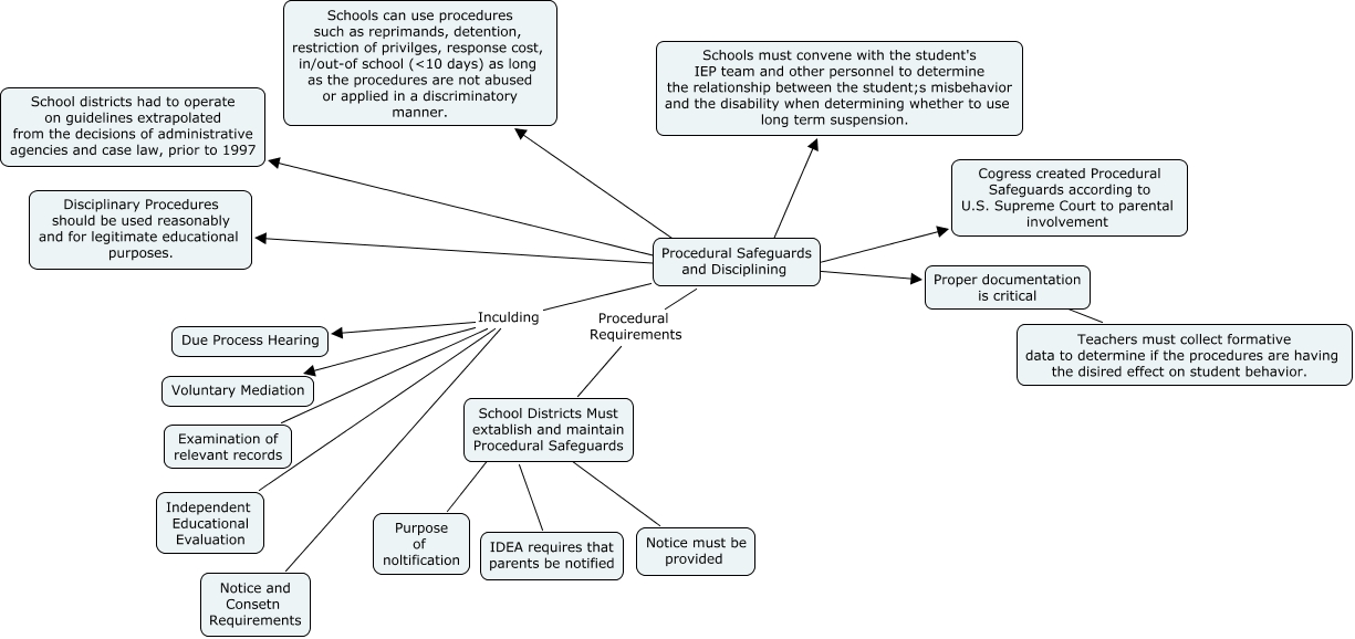 This Concept Map, created with IHMC CmapTools, has information related to: Procedural Safegaurds and Disciplining, Procedural Safeguards and Disciplining ???? Cogress created Procedural Safeguards according to U.S. Supreme Court to parental involvement, School Districts Must extablish and maintain Procedural Safeguards ???? Notice must be provided, Procedural Safeguards and Disciplining Inculding Voluntary Mediation, Procedural Safeguards and Disciplining Inculding Notice and Consetn Requirements, Procedural Safeguards and Disciplining ???? Schools can use procedures such as reprimands, detention, restriction of privilges, response cost, in/out-of school ( days) as long as the procedures are not abused or applied in a discriminatory manner., Procedural Safeguards and Disciplining ???? Proper documentation is critical, Procedural Safeguards and Disciplining ???? Disciplinary Procedures should be used reasonably and for legitimate educational purposes., Procedural Safeguards and Disciplining ???? Schools must convene with the student's IEP team and other personnel to determine the relationship between the student;s misbehavior and the disability when determining whether to use long term suspension., Procedural Safeguards and Disciplining Inculding Independent Educational Evaluation, Proper documentation is critical ???? Teachers must collect formative data to determine if the procedures are having the disired effect on student behavior., Procedural Safeguards and Disciplining Inculding Examination of relevant records, School Districts Must extablish and maintain Procedural Safeguards ???? Purpose of noltification, Procedural Safeguards and Disciplining Inculding Due Process Hearing, Procedural Safeguards and Disciplining Procedural Requirements School Districts Must extablish and maintain Procedural Safeguards, Procedural Safeguards and Disciplining ???? School districts had to operate on guidelines extrapolated from the decisions of administrative agencies and case law, prior to 1997, School Districts Must extablish and maintain Procedural Safeguards ???? IDEA requires that parents be notified