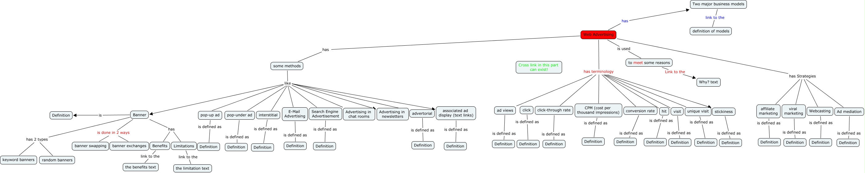 This Concept Map, created with IHMC CmapTools, has information related to: Web Advertising, Web Advertising has Strategies affiliate marketing, Web Advertising has Strategies Webcasting, Web Advertising is used to meet some reasons, Banner is Definition, Banner is done in 2 ways banner swapping, hit is defined as Definition, visit is defined as Definition, Two major business models link to the definition of models, E-Mail Advertising is defined as Definition, unique visit is defined as Definition, some methods like Advertising in newsletters, some methods like interstitial, Search Engine Advertisement is defined as Definition, Banner is done in 2 ways banner exchanges, pop-up ad is defined as Definition, Ad mediation is defined as Definition, Web Advertising has terminology hit, to meet some reasons Link to the Why? text, Web Advertising has terminology ad views, some methods like pop-up ad