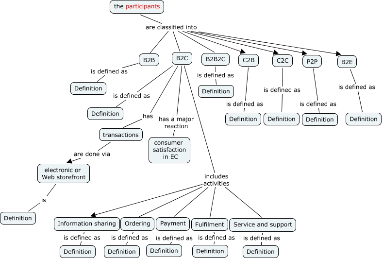 This Concept Map, created with IHMC CmapTools, has information related to: EC categories by the participants, B2B is defined as Definition, electronic or Web storefront is Definition, Payment is defined as Definition, C2C is defined as Definition, the participants are classified into B2C, B2C includes activities Service and support, B2C includes activities Payment, Service and support is defined as Definition, B2C is defined as Definition, Ordering is defined as Definition, the participants are classified into P2P, transactions are done via electronic or Web storefront, Fulfilment is defined as Definition, B2C has transactions, the participants are classified into C2B, the participants are classified into C2C, the participants are classified into B2B, the participants are classified into B2B2C, Information sharing is defined as Definition, B2C has a major reaction consumer satisfaction in EC