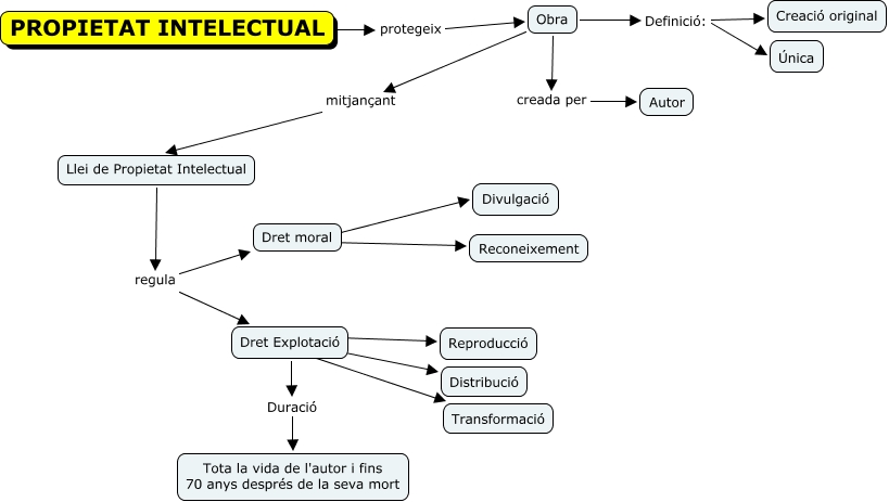 Aquest mapa conceptual conté informació relacionada amb: 3 - Intelectual (NOU!), Obra Definició: Creació original, Obra creada per Autor, Dret Explotació Duració Tota la vida de l'autor i fins 70 anys després de la seva mort, Llei de Propietat Intelectual regula Dret moral, Dret Explotació ???? Distribució, Obra mitjançant Llei de Propietat Intelectual, Llei de Propietat Intelectual regula Dret Explotació, Dret moral ???? Divulgació, Dret moral ???? Reconeixement, Dret Explotació ???? Reproducció, PROPIETAT INTELECTUAL protegeix Obra, Dret Explotació ???? Transformació, Obra Definició: Única