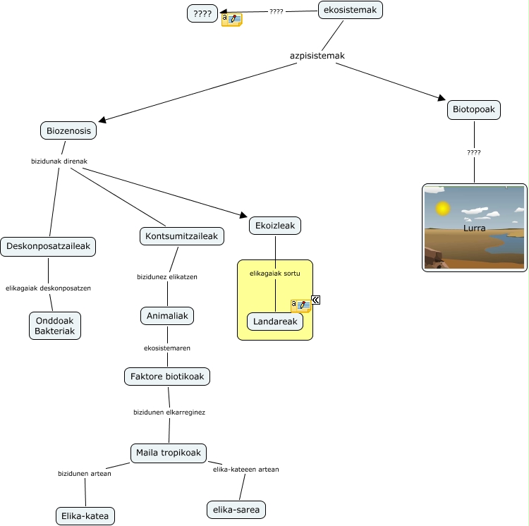 Este Cmap, tiene información relacionada con: Ekosistemak, Biozenosis bizidunak direnak Deskonposatzaileak, Biozenosis bizidunak direnak Kontsumitzaileak, Faktore biotikoak bizidunen elkarreginez Maila tropikoak, Ekoizleak elikagaiak sortu Landareak, ekosistemak ???? ????, Deskonposatzaileak elikagaiak deskonposatzen Onddoak Bakteriak, ekosistemak azpisistemak Biozenosis, Biotopoak ???? Lurra, ekosistemak azpisistemak Biotopoak, Biozenosis bizidunak direnak Ekoizleak, Maila tropikoak elika-kateeen artean elika-sarea, Maila tropikoak bizidunen artean Elika-katea, Kontsumitzaileak bizidunez elikatzen Animaliak, Animaliak ekosistemaren Faktore biotikoak