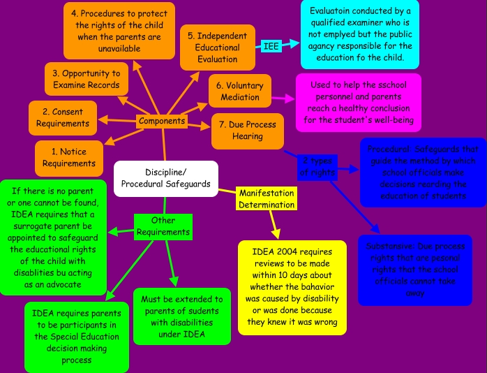 This Concept Map, created with IHMC CmapTools, has information related to: Amanda Lee Discipline - Procedural Safeguards, Discipline/ Procedural Safeguards Components 2. Consent Requirements, 7. Due Process Hearing 2 types of rights Substansive: Due process rights that are pesonal rights that the school officials cannot take away, Discipline/ Procedural Safeguards Components 7. Due Process Hearing, Discipline/ Procedural Safeguards Components 6. Voluntary Mediation, Discipline/ Procedural Safeguards Components 4. Procedures to protect the rights of the child when the parents are unavailable, Discipline/ Procedural Safeguards Other Requirements If there is no parent or one cannot be found, IDEA requires that a surrogate parent be appointed to safeguard the educational rights of the child with disablities bu acting as an advocate, Discipline/ Procedural Safeguards Other Requirements IDEA requires parents to be participants in the Special Education decision making process, 7. Due Process Hearing 2 types of rights Procedural: Safeguards that guide the method by which school officials make decisions rearding the education of students, Discipline/ Procedural Safeguards Components 3. Opportunity to Examine Records, Discipline/ Procedural Safeguards Components 1. Notice Requirements, Discipline/ Procedural Safeguards Manifestation Determination IDEA 2004 requires reviews to be made within 10 days about whether the bahavior was caused by disability or was done because they knew it was wrong, 6. Voluntary Mediation ???? Used to help the sschool personnel and parents reach a healthy conclusion for the student's well-being, 5. Independent Educational Evaluation IEE Evaluatoin conducted by a qualified examiner who is not emplyed but the public agancy responsible for the education fo the child., Discipline/ Procedural Safeguards Other Requirements Must be extended to parents of sudents with disabilities under IDEA, Discipline/ Procedural Safeguards Components 5. Independent Educational Evaluation