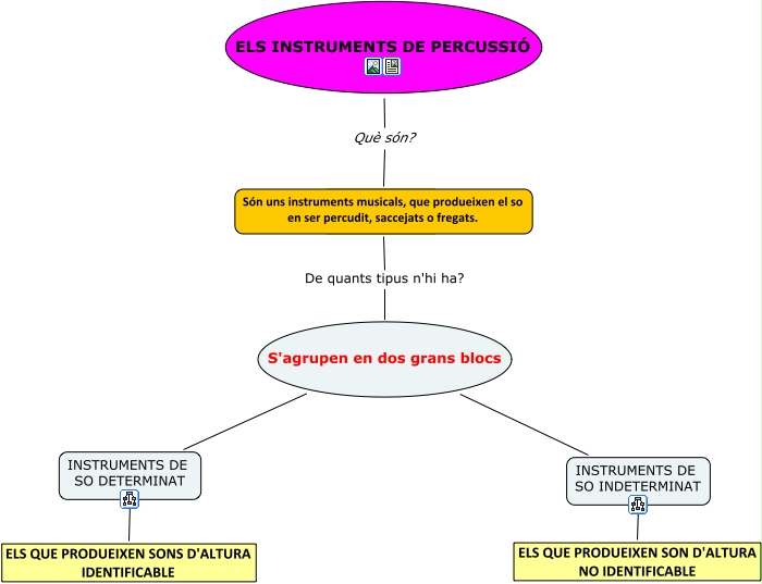 Este Cmap, tiene información relacionada con: instruments_percussio, ELS INSTRUMENTS DE PERCUSSIÓ Què són? Són uns instruments musicals, que produeixen el so en ser percudit, saccejats o fregats., S'agrupen en dos grans blocs INSTRUMENTS DE SO DETERMINAT, S'agrupen en dos grans blocs INSTRUMENTS DE SO INDETERMINAT, INSTRUMENTS DE SO DETERMINAT ELS QUE PRODUEIXEN SONS D'ALTURA IDENTIFICABLE, Són uns instruments musicals, que produeixen el so en ser percudit, saccejats o fregats. De quants tipus n'hi ha? S'agrupen en dos grans blocs, INSTRUMENTS DE SO INDETERMINAT ELS QUE PRODUEIXEN SON D'ALTURA NO IDENTIFICABLE