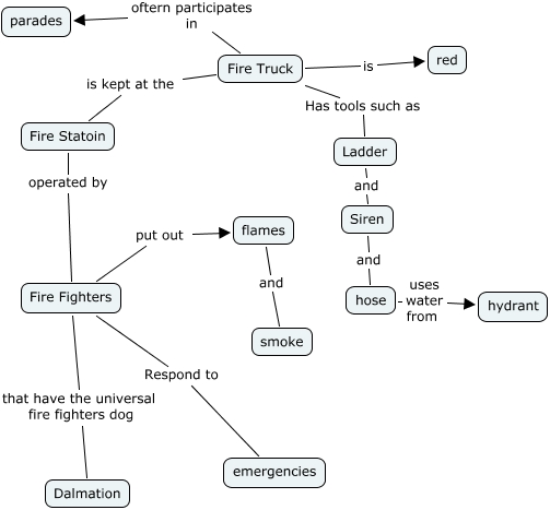 This Concept Map, created with IHMC CmapTools, has information related to: Fire Truck, Fire Statoin operated by Fire Fighters, hose uses water from hydrant, Fire Truck Has tools such as Ladder, Fire Fighters put out flames, flames and smoke, Fire Truck is kept at the Fire Statoin, Ladder and Siren, Fire Fighters Respond to emergencies, Fire Truck oftern participates in parades, Fire Truck is red, Fire Fighters that have the universal fire fighters dog Dalmation, Siren and hose