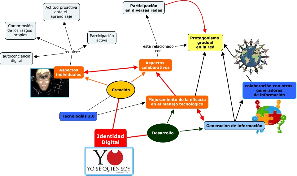 Este Cmap, tiene información relacionada con: Identidad digital v1, Participación en diversas redes ???? Protagonismo gradual en la red, Aspectos individuales requiere autoconciencia digital, Identidad Digital Creación Aspectos colaborativos, Aspectos colaborativos ???? Aspectos individuales, Aspectos individuales requiere Parcicipación activa, Identidad Digital Creación Tecnologías 2.0, Aspectos colaborativos esta relacionado con Protagonismo gradual en la red, Identidad Digital Creación Aspectos individuales, Tecnologías 2.0 ???? Mejoramiento de la eficacia en el manejo tecnologico, Aspectos individuales requiere Comprensión de los rasgos propios, Identidad Digital Desarrollo Generación de información, Mejoramiento de la eficacia en el manejo tecnologico ???? Aspectos colaborativos, Identidad Digital Desarrollo Mejoramiento de la eficacia en el manejo tecnologico, Mejoramiento de la eficacia en el manejo tecnologico ???? Protagonismo gradual en la red, Aspectos individuales requiere Actitud proactiva ante el aprendizaje, colaboración con otros generadores de información ???? Protagonismo gradual en la red, Generación de información ???? Protagonismo gradual en la red, Aspectos colaborativos esta relacionado con Participación en diversas redes, Generación de información ???? colaboración con otros generadores de información, Mejoramiento de la eficacia en el manejo tecnologico ???? Generación de información