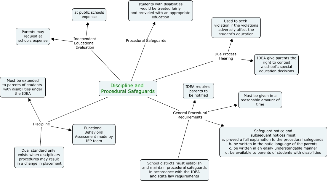 This Concept Map, created with IHMC CmapTools, has information related to: Jennifer Cottrell Disc Proc, Discipline and Procedural Safeguards Due Process Hearing Used to seek violation if the violations adversely affect the student's education, Discipline and Procedural Safeguards General Procedural Requirements Safeguard notice and subsequent notices must a. proved a full explanation fo the procedural safeguards b. be written in the natie language of the parents c. be written in an easily understandable manner d. be available to parents of students with disabilities, Discipline and Procedural Safeguards Discipline Dual standard only exists when disciplinary procedures may result in a change in placement, Discipline and Procedural Safeguards Discipline Functional Behavioral Assessment made by IEP team, Discipline and Procedural Safeguards Discipline Must be extended to parents of students with disabilities under the IDEA, Discipline and Procedural Safeguards General Procedural Requirements School districts must establish and maintain procedural safeguards in accordance with the IDEA and state law requirements, Discipline and Procedural Safeguards Independent Educational Evaluation at public schools expense, Discipline and Procedural Safeguards Independent Educational Evaluation Parents may request at schools expense, Discipline and Procedural Safeguards General Procedural Requirements IDEA requires parents to be notified, Discipline and Procedural Safeguards Due Process Hearing IDEA give parents the right to contest a school's special education decisions, Discipline and Procedural Safeguards Procedural Safeguards students with disabilities would be treated fairly and provided with an appropriate education, Discipline and Procedural Safeguards General Procedural Requirements Must be given in a reasonable amount of time
