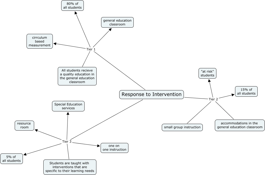 This Concept Map, created with IHMC CmapTools, has information related to: Jennifer Cottrell RTI, Response to Intervention Tier 1 80% of all students, Response to Intervention Tier 2 15% of all students, Response to Intervention Tier 3 resource room, Response to Intervention Tier 2 "at risk" students, Response to Intervention Tier 2 small group instruction, Response to Intervention Tier 1 cirrculum based measurement, Response to Intervention Tier 2 accommodations in the general education classroom, Response to Intervention Tier 1 All students recieve a quality education in the general education classroom, Response to Intervention Tier 1 general education classroom, Response to Intervention Tier 3 5% of all students, Response to Intervention Tier 3 one on one instruction, Response to Intervention Tier 3 Special Education services, Response to Intervention Tier 3 Students are taught with interventions that are specific to their learning needs