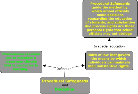 This Concept Map, created with IHMC CmapTools, has information related to: Procedural Safeguards and Discipline, Rules of law that govern the means by which individuals can maintain their substantive rights. In special education Procedural Safeguards guide the method by which school officials make decisions reguarding the education of students, and substantive due process rights are those personal rights that school officials may not abridge, Procedural Safeguards and Discipline Definition Prodcedures teachers use to maintain a classroom climate that is conducive to learning., Procedural Safeguards and Discipline Definition Rules of law that govern the means by which individuals can maintain their substantive rights.
