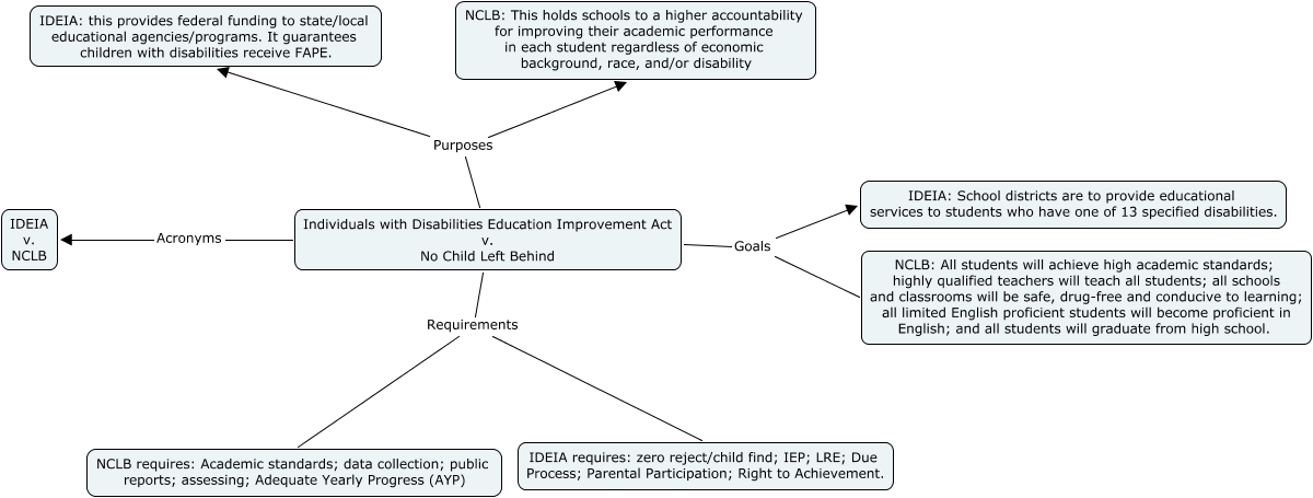 This Concept Map, created with IHMC CmapTools, has information related to: IDEIA and NCLB, Individuals with Disabilities Education Improvement Act v. No Child Left Behind Purposes IDEIA: this provides federal funding to state/local educational agencies/programs. It guarantees children with disabilities receive FAPE., Individuals with Disabilities Education Improvement Act v. No Child Left Behind Requirements IDEIA requires: zero reject/child find; IEP; LRE; Due Process; Parental Participation; Right to Achievement., Individuals with Disabilities Education Improvement Act v. No Child Left Behind Goals NCLB: All students will achieve high academic standards; highly qualified teachers will teach all students; all schools and classrooms will be safe, drug-free and conducive to learning; all limited English proficient students will become proficient in English; and all students will graduate from high school., Individuals with Disabilities Education Improvement Act v. No Child Left Behind Requirements NCLB requires: Academic standards; data collection; public reports; assessing; Adequate Yearly Progress (AYP), Individuals with Disabilities Education Improvement Act v. No Child Left Behind Goals IDEIA: School districts are to provide educational services to students who have one of 13 specified disabilities., Individuals with Disabilities Education Improvement Act v. No Child Left Behind Purposes NCLB: This holds schools to a higher accountability for improving their academic performance in each student regardless of economic background, race, and/or disability, Individuals with Disabilities Education Improvement Act v. No Child Left Behind Acronyms IDEIA v. NCLB