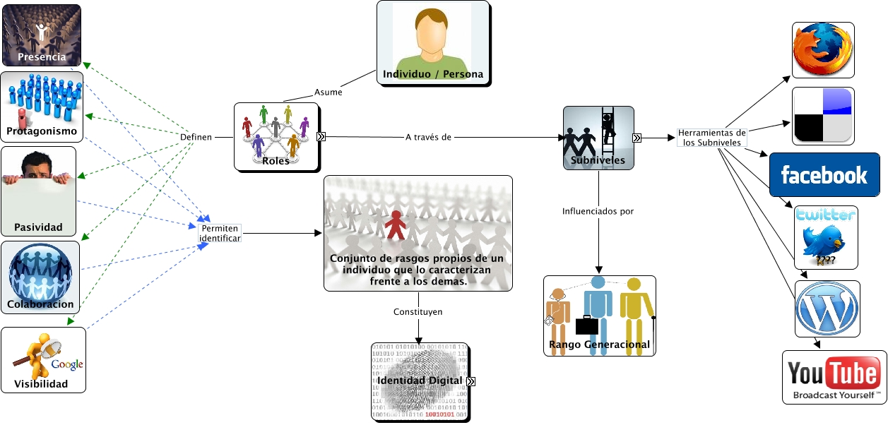 This Concept Map, created with IHMC CmapTools, has information related to: identidad_digital2, Protagonismo Permiten identificar Conjunto de rasgos propios de un individuo que lo caracterizan frente a los demas., Subniveles Herramientas de los Subniveles, Subniveles Herramientas de los Subniveles, Roles Definen Visibilidad, Roles Definen Colaboracion, Presencia Permiten identificar Conjunto de rasgos propios de un individuo que lo caracterizan frente a los demas., Roles Definen Pasividad, Subniveles Herramientas de los Subniveles ????, Conjunto de rasgos propios de un individuo que lo caracterizan frente a los demas. Constituyen Identidad del Individuo, Roles A través de Contribuir, compartir, interaccionar., Visibilidad Permiten identificar Conjunto de rasgos propios de un individuo que lo caracterizan frente a los demas., Roles Definen Presencia, Subniveles Herramientas de los Subniveles, Individuo / Persona Asume Roles, Colaboracion Permiten identificar Conjunto de rasgos propios de un individuo que lo caracterizan frente a los demas., Pasividad Permiten identificar Conjunto de rasgos propios de un individuo que lo caracterizan frente a los demas., Subniveles Herramientas de los Subniveles, Subniveles Influenciados por Rango Generacional, Subniveles Herramientas de los Subniveles, Roles Definen Protagonismo