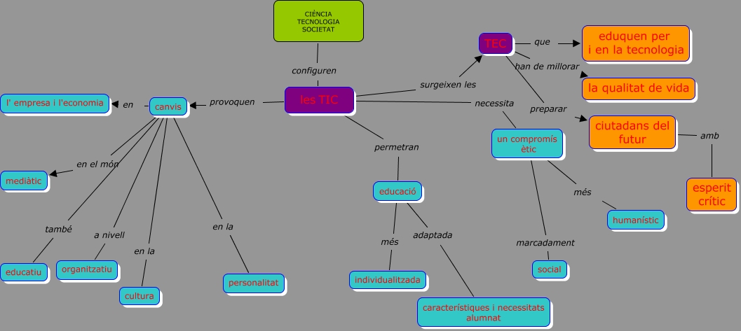 Aquest mapa conceptual conté informació relacionada amb: mapa pac 1.5, canvis en la personalitat, les TIC provoquen canvis, TEC han de millorar la qualitat de vida, canvis en l' empresa i l'economia, les TIC necessita un compromís ètic, educació adaptada característiques i necessitats alumnat, les TIC permetran educació, TEC que eduquen per i en la tecnologia, canvis a nivell organitzatiu, canvis també educatiu, TEC preparar ciutadans del futur, canvis en la cultura, CIÈNCIA TECNOLOGIA SOCIETAT configuren les TIC, canvis en el món mediàtic, un compromís ètic més humanístic, educació més individualitzada, ciutadans del futur amb esperit crític, les TIC surgeixen les TEC, un compromís ètic marcadament social