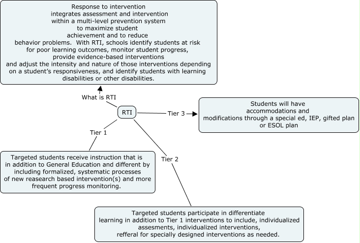 This Concept Map, created with IHMC CmapTools, has information related to: RTI, RTI What is RTI Response to intervention integrates assessment and intervention within a multi-level prevention system to maximize student achievement and to reduce behavior problems. With RTI, schools identify students at risk for poor learning outcomes, monitor student progress, provide evidence-based interventions and adjust the intensity and nature of those interventions depending on a student’s responsiveness, and identify students with learning disabilities or other disabilities., RTI Tier 1 Targeted students receive instruction that is in addition to General Education and different by including formalized, systematic processes of new reasearch based intervention(s) and more frequent progress monitoring., RTI Tier 3 Students will have accommodations and modifications through a special ed, IEP, gifted plan or ESOL plan, RTI Tier 2 Targeted students participate in differentiate learning in addition to Tier 1 interventions to include, individualized assesments, individualized interventions, refferal for specially designed interventions as needed.