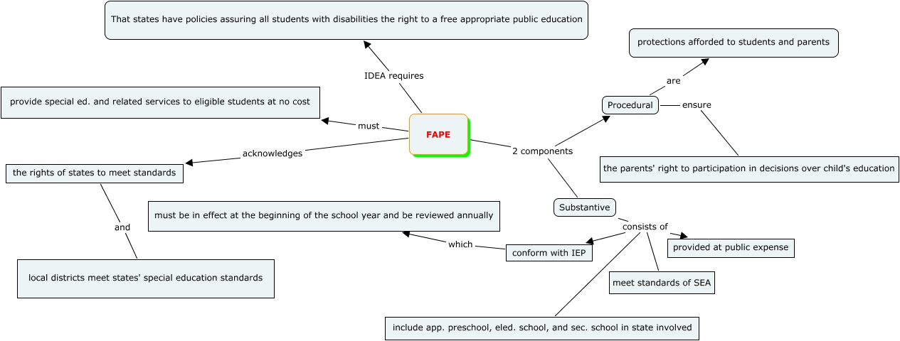 This Concept Map, created with IHMC CmapTools, has information related to: FAPE, Substantive consists of provided at public expense, FAPE must provide special ed. and related services to eligible students at no cost, FAPE 2 components Substantive, Substantive consists of conform with IEP, the rights of states to meet standards and local districts meet states' special education standards, FAPE IDEA requires That states have policies assuring all students with disabilities the right to a free appropriate public education, Substantive consists of include app. preschool, eled. school, and sec. school in state involved, Procedural are protections afforded to students and parents, FAPE 2 components Procedural, FAPE acknowledges the rights of states to meet standards, Substantive consists of meet standards of SEA, Procedural ensure the parents' right to participation in decisions over child's education, conform with IEP which must be in effect at the beginning of the school year and be reviewed annually