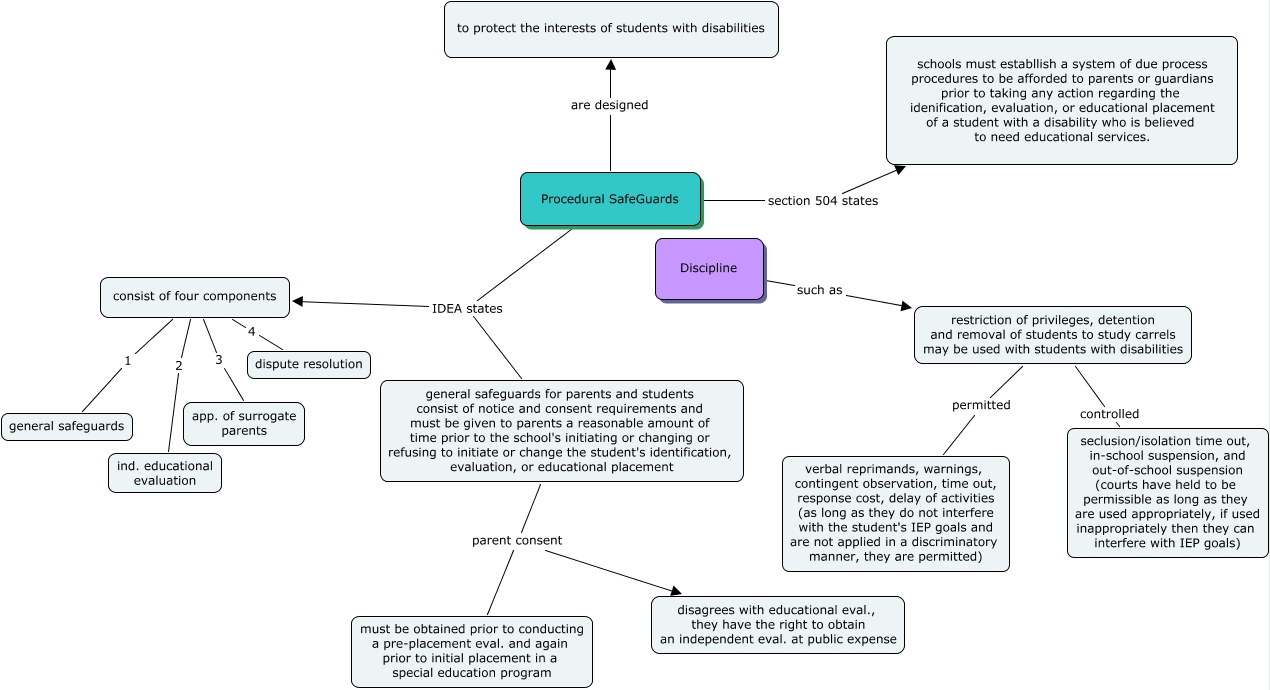 This Concept Map, created with IHMC CmapTools, has information related to: Discipline Pro Safeguards, Procedural SafeGuards are designed to protect the interests of students with disabilities, consist of four components 2 ind. educational evaluation, Discipline such as restriction of privileges, detention and removal of students to study carrels may be used with students with disabilities, general safeguards for parents and students consist of notice and consent requirements and must be given to parents a reasonable amount of time prior to the school's initiating or changing or refusing to initiate or change the student's identification, evaluation, or educational placement parent consent must be obtained prior to conducting a pre-placement eval. and again prior to initial placement in a special education program, Procedural SafeGuards IDEA states consist of four components, general safeguards for parents and students consist of notice and consent requirements and must be given to parents a reasonable amount of time prior to the school's initiating or changing or refusing to initiate or change the student's identification, evaluation, or educational placement parent consent disagrees with educational eval., they have the right to obtain an independent eval. at public expense, Procedural SafeGuards IDEA states general safeguards for parents and students consist of notice and consent requirements and must be given to parents a reasonable amount of time prior to the school's initiating or changing or refusing to initiate or change the student's identification, evaluation, or educational placement, Procedural SafeGuards section 504 states schools must establlish a system of due process procedures to be afforded to parents or guardians prior to taking any action regarding the idenification, evaluation, or educational placement of a student with a disability who is believed to need educational services., restriction of privileges, detention and removal of students to study carrels may be used with students with disabilities permitted verbal reprimands, warnings, contingent observation, time out, response cost, delay of activities (as long as they do not interfere with the student's IEP goals and are not applied in a discriminatory manner, they are permitted), consist of four components 4 dispute resolution, restriction of privileges, detention and removal of students to study carrels may be used with students with disabilities controlled seclusion/isolation time out, in-school suspension, and out-of-school suspension (courts have held to be permissible as long as they are used appropriately, if used inappropriately then they can interfere with IEP goals), consist of four components 1 general safeguards, consist of four components 3 app. of surrogate parents