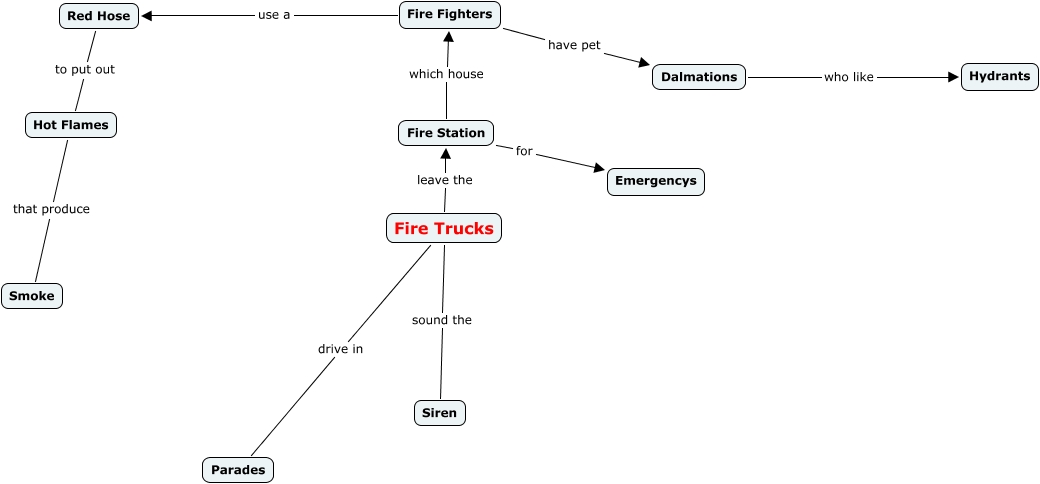 This Concept Map, created with IHMC CmapTools, has information related to: fire truck, Red Hose to put out Hot Flames, Fire Trucks leave the Fire Station, Fire Station for Emergencys, Dalmations who like Hydrants, Fire Trucks sound the Siren, Fire Fighters use a Red Hose, Fire Fighters have pet Dalmations, Hot Flames that produce Smoke, Fire Station which house Fire Fighters, Fire Trucks drive in Parades