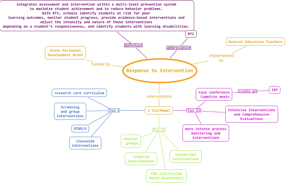 This Concept Map, created with IHMC CmapTools, has information related to: RTI, 3 TeirModel Teir II Smaller groups, 3 TeirModel Teir I classwide interventions, 3 TeirModel Teir II researched interventions, 3 TeirModel Teir III Intensive Interventions and Comprehensive Evaluations, 3 TeirModel Teir I research core curriculum, 3 TeirModel Teir II CBA (Curriculum Based Assessment), 3 TeirModel Teir I DIBELS, 3 TeirModel Teir I Screening and group interventions, 3 TeirModel Teir III Case conference Committe meets, Case conference Committe meets create an IEP, 3 TeirModel Teir III more intense process monitoring and interventions, Response to Intervention definition integrates assessment and intervention within a multi-level prevention system to maximize student achievement and to reduce behavior problems. With RTI, schools identify students at risk for poor learning outcomes, monitor student progress, provide evidence-based interventions and adjust the intensity and nature of those interventions depending on a student’s responsiveness, and identify students with learning disabilities., Response to Intervention funded by State Personnel Development Grant, Response to Intervention implemented by General Education Teachers, Response to Intervention abbreviation RTI, 3 TeirModel Teir II Targeted Interventions, Response to Intervention interventions 3 TeirModel