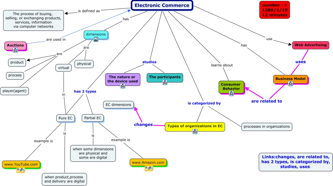 This Concept Map, created with IHMC CmapTools, has information related to: Map of Maps, Pure EC example is www.YouTube.com, dimensions are product, dimensions are process, dimensions are physical, Auctions are used in Electronic Commerce, Electronic Commerce use Web Advertising, Partial EC example is www.Amazon.com, Electronic Commerce is categorized by processes in organizations, Electronic Commerce learns about Consumer Behavior, Electronic Commerce has Business Model, dimensions are player(agent), Web Advertising uses Business Model, Electronic Commerce has 2 types Pure EC, Business Model are related to Consumer Behavior, Electronic Commerce studies The nature or the device used, Electronic Commerce is defined as The process of buying, selling, or exchanging products, services, information via computer networks, Electronic Commerce has dimensions, virtual in Pure EC, Types of organizations in EC changes EC dimensions, Electronic Commerce is categorized by Types of organizations in EC