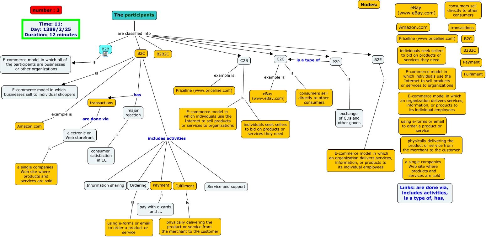 This Concept Map, created with IHMC CmapTools, has information related to: EC categories by the participants, C2B is E-commerce model in which individuals use the Internet to sell products or services to organizations, C2C example is eBay (www.eBay.com), B2C includes activities Service and support, P2P is a type of C2C, The participants are classified into B2C, B2C includes activities Payment, C2C is consumers sell directly to other consumers, The participants are classified into B2B, major reaction is consumer satisfaction in EC, B2C includes activities Ordering, B2B is E-commerce model in which all of the participants are businesses or other organizations, Fulfilment is physically delivering the product or service from the merchant to the customer, Ordering is using e-forms or email to order a product or service, electronic or Web storefront is a single companies Web site where products and services are sold, transactions are done via electronic or Web storefront, B2C includes activities Fulfilment, Payment is pay with e-cards and ..., B2C example is Amazon.com, C2B is individuals seek sellers to bid on products or services they need, The participants are classified into B2B2C